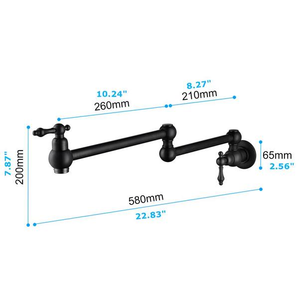 WELLFOR Wall Mount Pot Filler Faucet in Matte Black, 360-Degree Capability, 4 GPM Capacity for Mediterranean-Style Kitchens (Model WA-TH8045RB01). This dual-handle faucet features a foldable arm for ease of use and space-saving. Designed to fit Mediterranean-style kitchens, it delivers efficient water flow at 4 GPM. Comes in the original packaging and includes installation instructions. Pickup only.