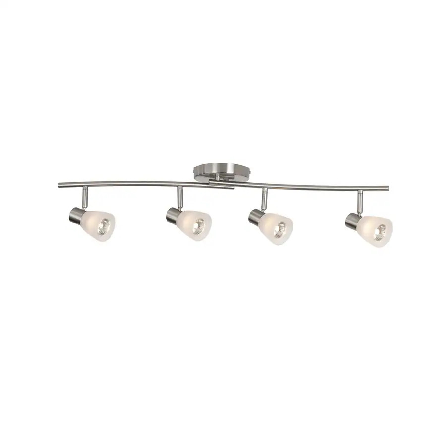 Style Selections 33.5 Inch 4-Head Adjustable Track Light in Brushed Nickel (Model EC3088SBA). Features frosted glass shades and an adjustable design for directional lighting. Dimensions are 33.5 inches in length and 6.85 inches in height. The light is new in original packaging, though the box shows minor wear. Pickup only.
