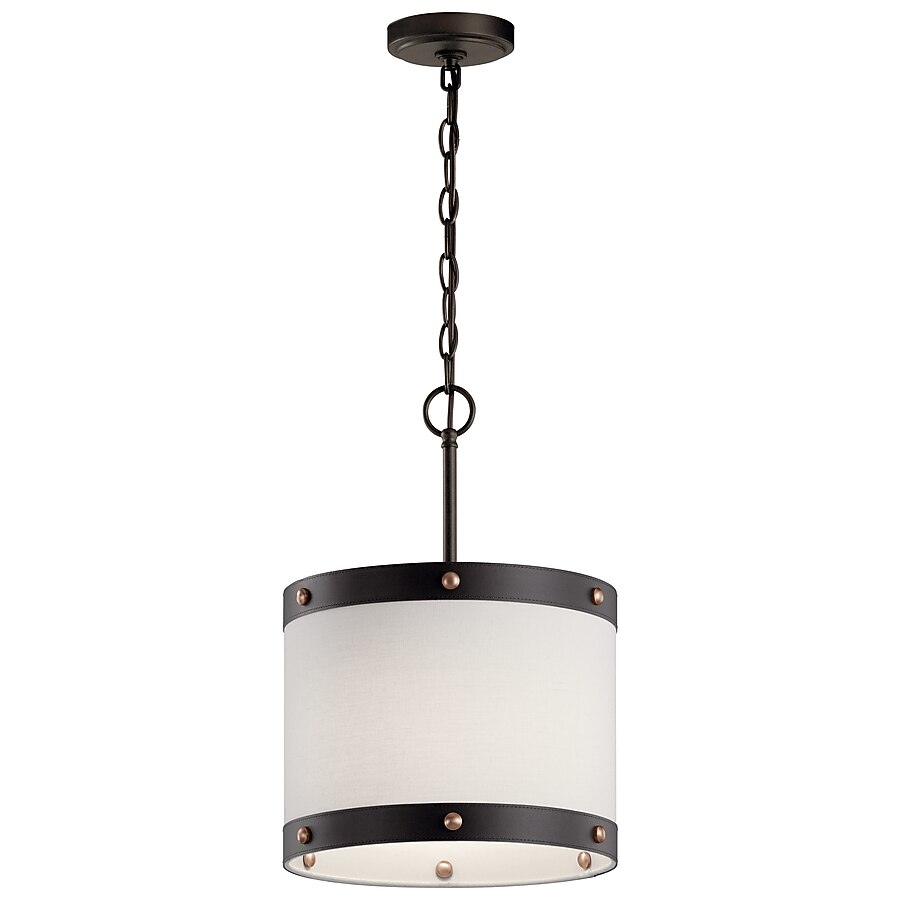 Kichler Rayleigh 60W 1-Light Pendant in Olde Bronze Finish, Model 82324. This pendant features a contemporary design with an Olde Bronze finish and a durable fabric drum shade. Offers a maximum wattage of 60W and comes with instructions and mounting hardware. The light is new in its original packaging. Pickup only.