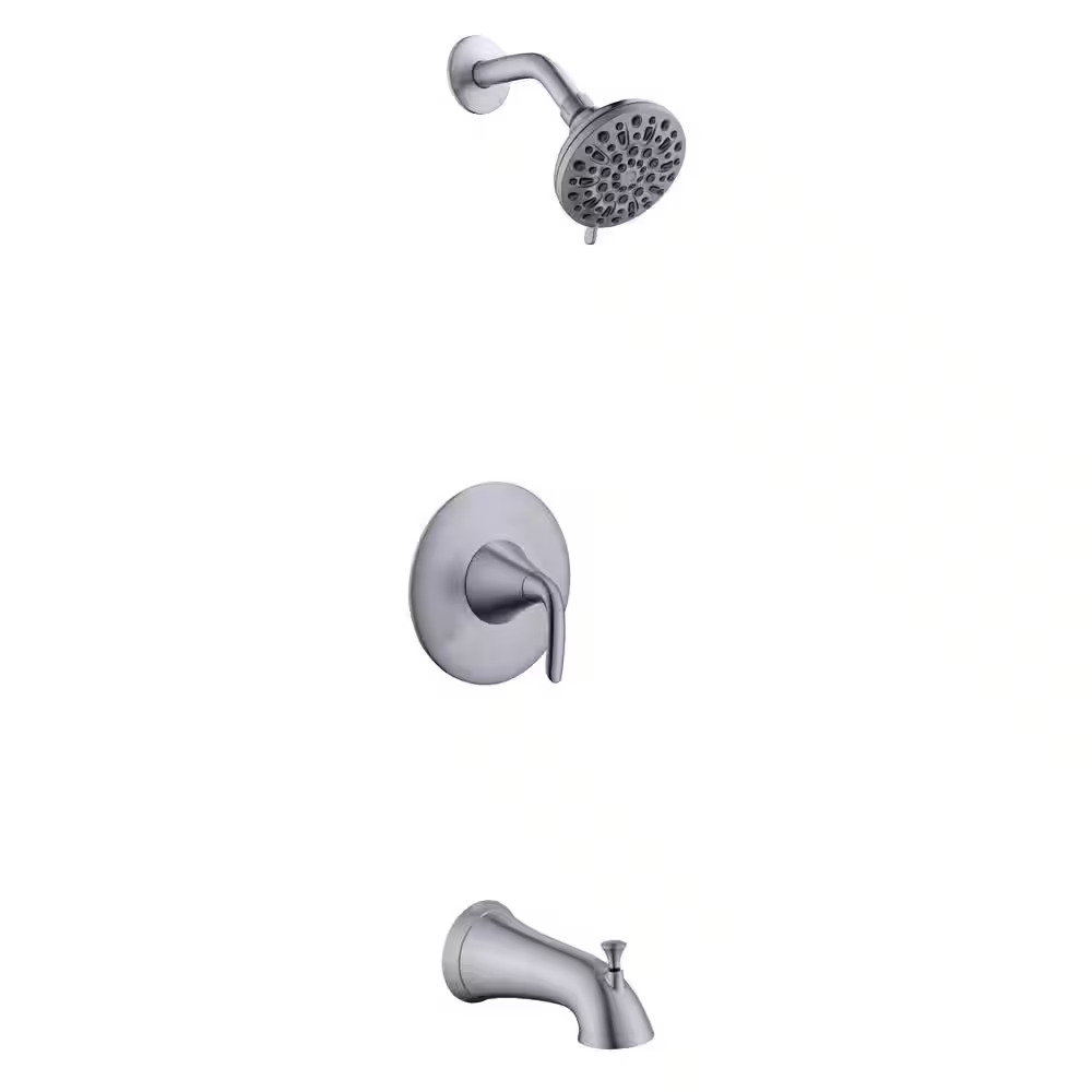 Glacier Bay Irena Single-Handle 6-Spray Tub and Shower Faucet in Brushed Nickel (Model HD873X-8E04). This faucet includes a six-spray showerhead, single-handle control, and tub spout. Made from durable materials with a brushed nickel finish. Pieces are packaged securely in the original box and include all components as shown. Pickup only.
