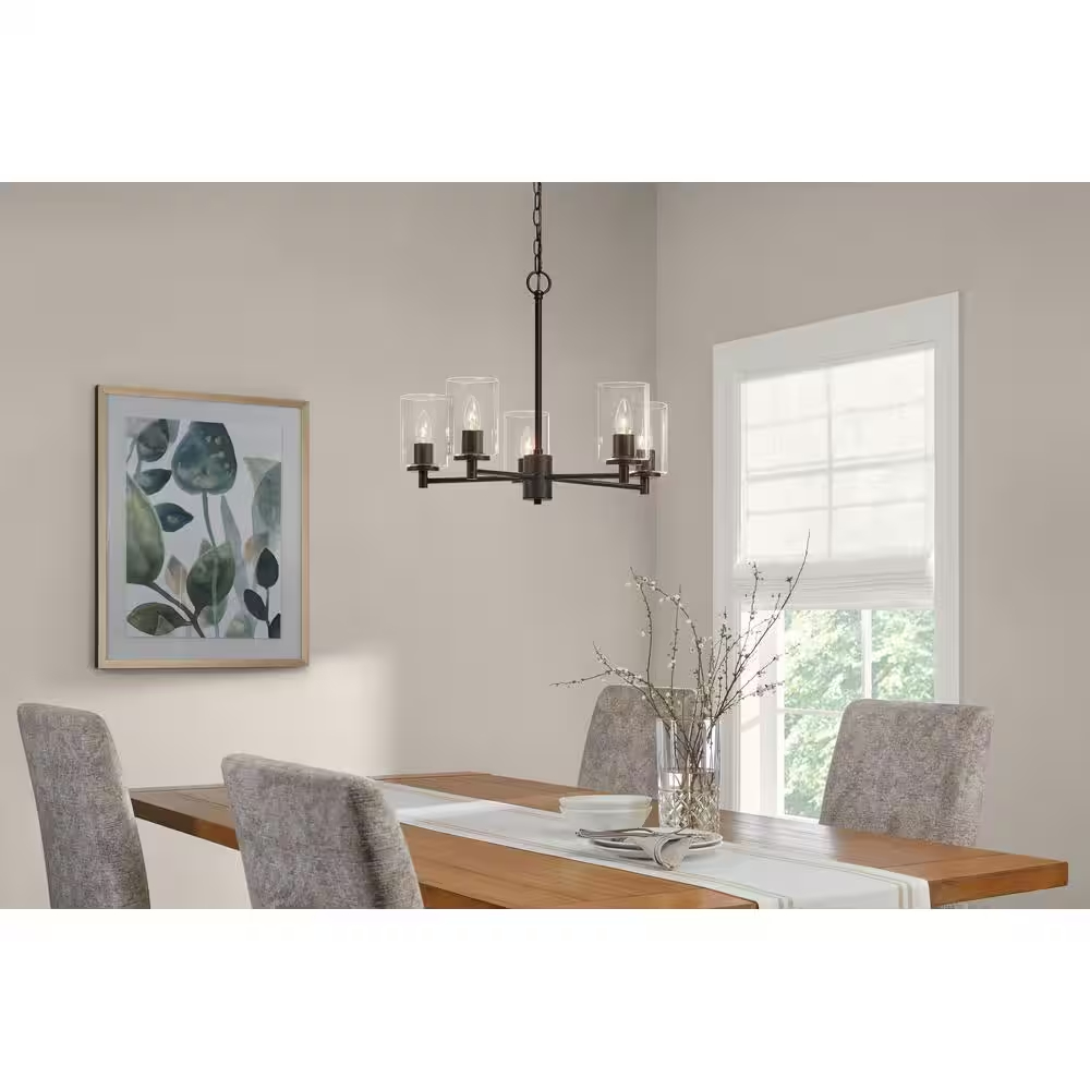 Monteaux Lighting 5-Light Black Chandelier with Clear Glass Shades (Model BAL-004). Features a black finish with clear glass shades and includes mounting hardware. Designed for use in dining rooms, kitchens, or other spaces requiring a hanging light fixture. Pickup only.