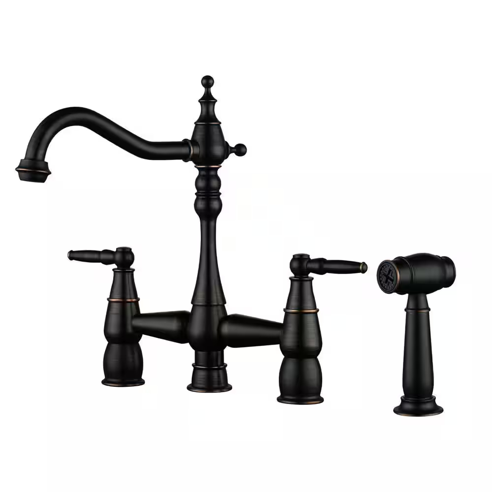 WOWOW Double-Handle Deck-Mount Bridge Kitchen Faucet with Sprayer in Oil Rubbed Bronze (Model 2317001RB). Includes faucet, sprayer, hoses, and installation accessories. Comes in original box with instruction manual. Box shows signs of wear, but contents appear unused. Pickup only.