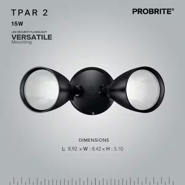 ProBrite Twin-Head Directional Bronze Outdoor Integrated LED Flood Light for Outdoor Security (Model TPAR2-PC-BZ). This 15-watt floodlight provides 1500 lumens of brightness and features a dual-head design for versatile mounting. It includes an integrated photocell and has a color rendering index (CRI) of 80 with a daylight 4000K color temperature. Dimensions are 8.92 inches (L) x 8.42 inches (W) x 5.10 inches (H). Pickup only.