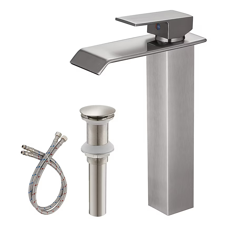BWE Waterfall Single Hole Single Handle Bathroom Vessel Sink Faucet with Pop-Up Drain Assembly in Brushed Nickel (Model A-96004H-N). Includes faucet, pop-up drain, and necessary installation components. Comes in original packaging with instructions. Appears unused and in excellent condition. Pickup only.