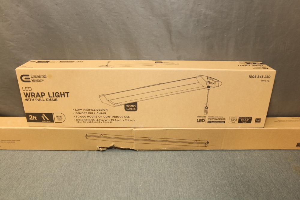 Commercial Electric 4 Foot Garage LED Linkable Matte Black Strip Light Fixture 3600LM 40W Bright White 4000K with 5 Foot Cord (Model 556141411) and Commercial Electric 1-Pack 2 Foot Closet LED Wraparound Light with Pull Chain 2000LM 20W 4000K (Model 568051410). Pickup only.