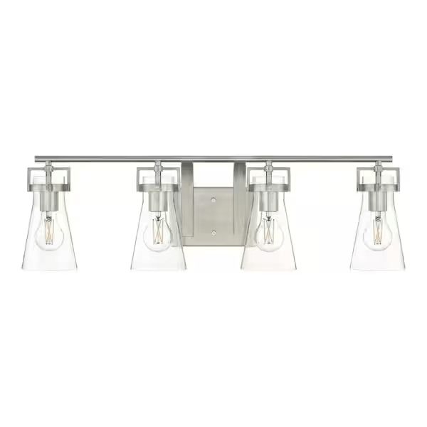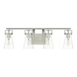 Home Decorators Collection Clermont 30.75 Inch 4-Light Brushed Nickel Bathroom Vanity Light with Seeded Glass Shade (Model 4001004SG-962). Features a brushed nickel finish with seeded glass shades and a deep base design. Measures 30.75 inches by 7.32 inches by 8.96 inches. Bulbs are not included. Pickup only.