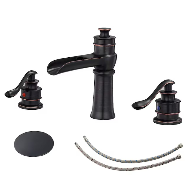 BWE 8 Inch Low-Arc Widespread 2-Handle Bathroom Sink Faucet in Oil Rubbed Bronze (Model A-96135-ORB-S). This set includes a low-arc spout, two handles, mounting hardware, and supply hoses. The faucet features an oil-rubbed bronze finish for a classic look and durability. The unit comes in its original packaging. Pickup only.