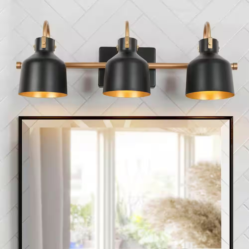 Uolfin 3-Light Black Modern Transitional Picture Wall Sconce, Gold Vanity Light with Metal Shades (Model 628U8FBNQUE4937). Features metal shades with a sleek two-tone black and gold design. Ideal for use as a vanity or picture wall sconce. The item is in its original packaging. Pickup only.