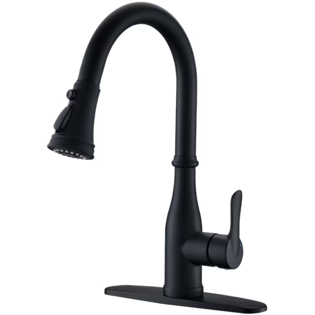 BWE Single-Handle Deck-Mount Pull-Down Matte Black Kitchen Faucet with Sprayer (Model A-94002-BLACK). Features a durable matte black finish and pull-down sprayer for ease of use. New in original packaging with parts and manual included. Pickup only.