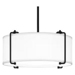 Home Decorators Collection 4-Light Matte Black Pendant with White Fabric Shade (Model HD19546P1). The pendant features a sleek matte black finish and a white fabric drum shade, creating a modern aesthetic. Fully packaged with parts and instruction manual included. Pickup only.
