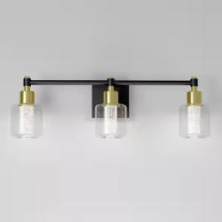 Artika Champagne Globe 26 Inch 3-Light Black and Gold Modern Integrated LED 5 CCT Vanity Light Bar for Bathroom with Bubble Glass (Model VAN3-CG5C-HD2BG). Features black and gold finishes with bubble glass shades. Integrated LED technology with a brightness of 1400 lumens, color temperature of 3000K, and lifespan of 50,000 hours. Measures 26 inches in width. Pickup only.