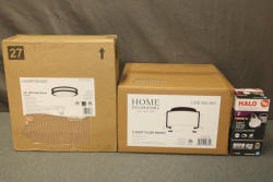 Home Decorators Collection 13 Inch 2-Light Matte Black Flush Mount with White Fabric Shade (Model HD19546F1), Hampton Bay Flaxmere 12 Inch Bronze Finish Dimmable LED Flush Mount Ceiling Light with Frosted White Glass Shade (Model HB1023C-34), and Halo 2 Inch Soft White Selectable CCT Integrated LED Recessed Light with Surface Mount White Trim Retrofit Module (Model LCR2089FS1EMW). Pickup only.