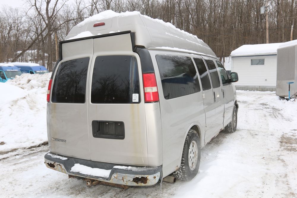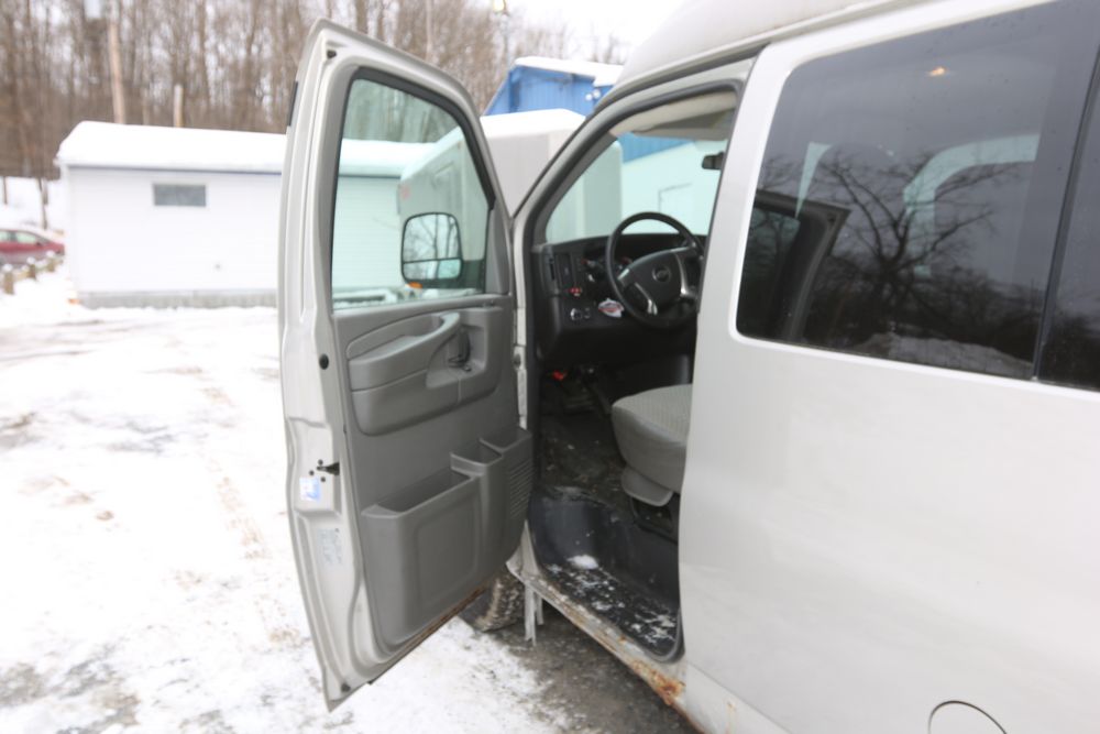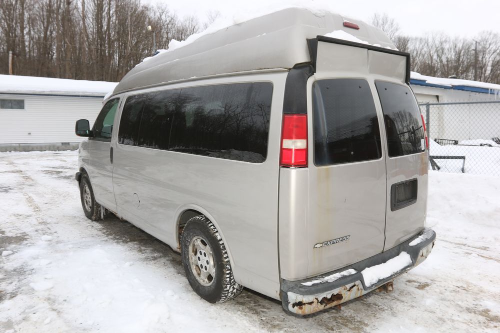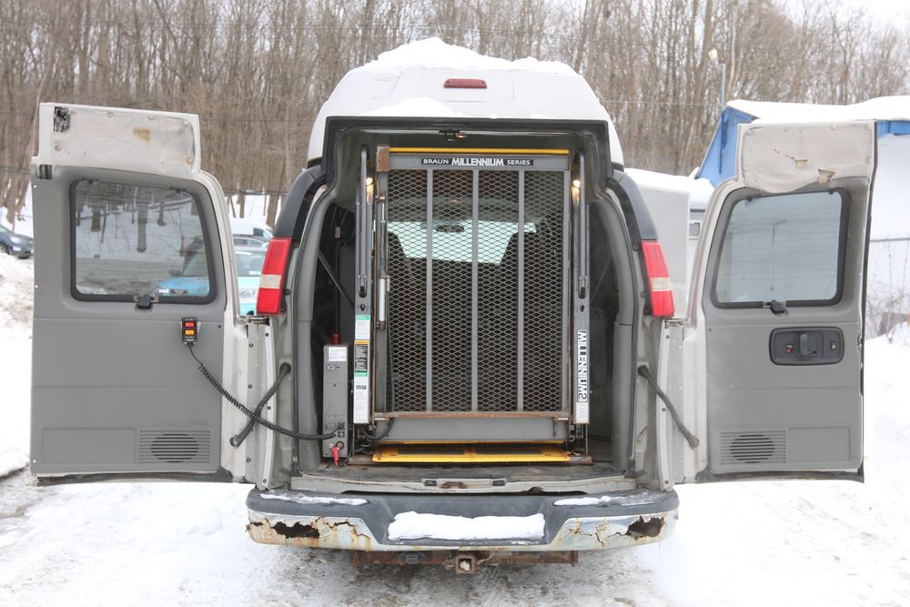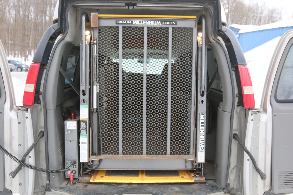 2008 Chevrolet Express LS 1500 AWD with a 5.3L V8 OHV 16V engine, VIN - 1GNFH154081170019, Odometer Reading: 100,929. Seller Reports: Body has some rust. Cloth and leather interior, power windows/locks/mirrors, steering wheel controls, AM/FM radio, CD player, heat & A/C, Millennium Wheel Chair Lift is fully functional, has 14,806 hours, and is Model: NL919IBTB-2. Runs and drives. Keys, Title, and Bill Of Sale available.