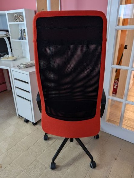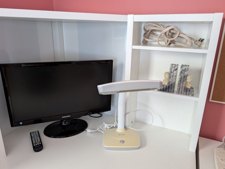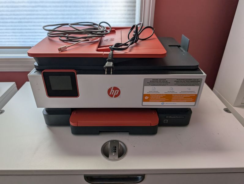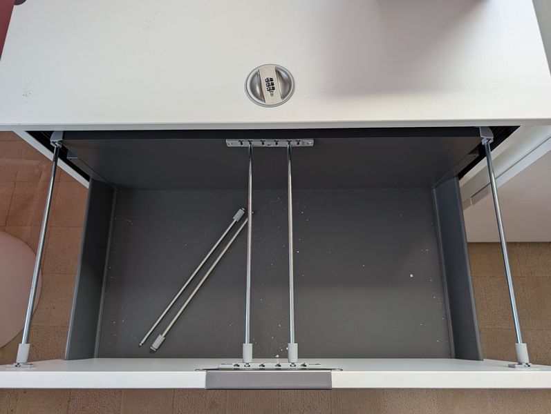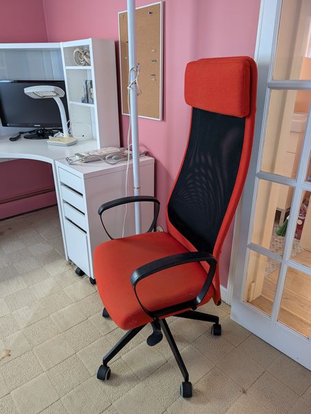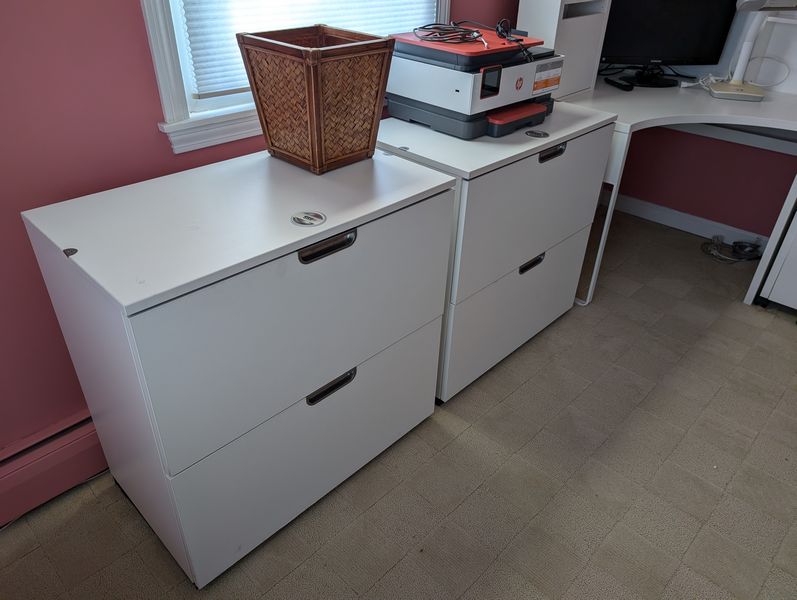 Contemporary Office Furniture. White modular office furniture, incl: pair of lateral files with combo locks, ea. 31.5"Wx18"Dx31"H; corner desk with hutch req 39" on each wall, 55"W overall x32"Dx55.5"H; three-drawer rolling cab; floor lamp, 6'H; adj modern desk chair, 2'Wx19"Dx49"H;HP JetPro 8035e printer; desk lamp; TV; trash pail; marble bookends; cords as seen in photos. Curtain not incl.