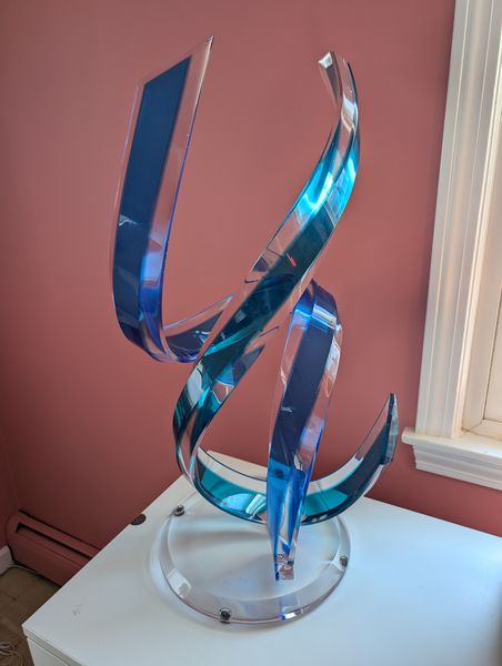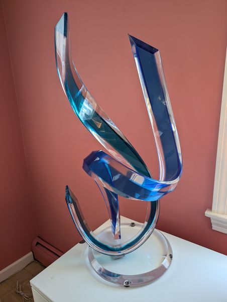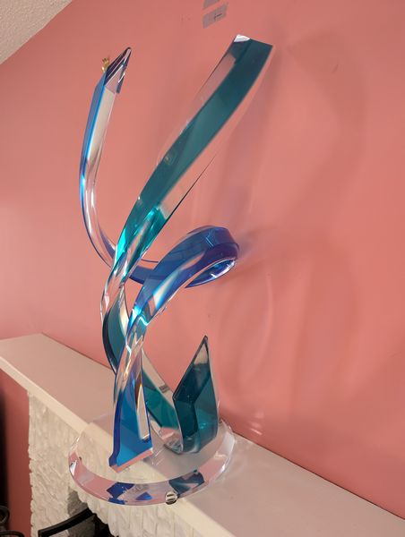 Muniz Modern Acrylic Sculpture. Blue acrylic modern twist sculpture signed Muniz, approx. 28"H.