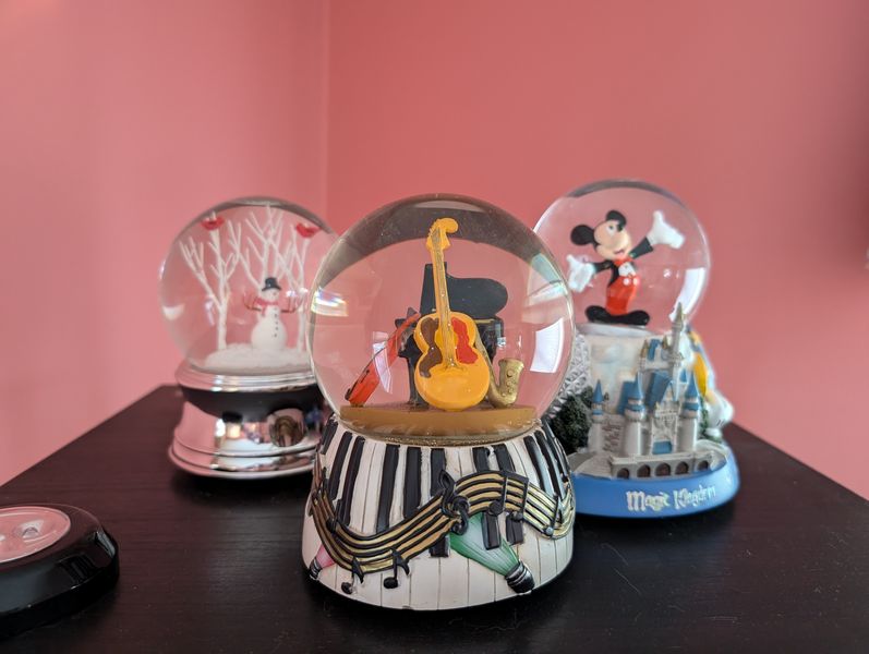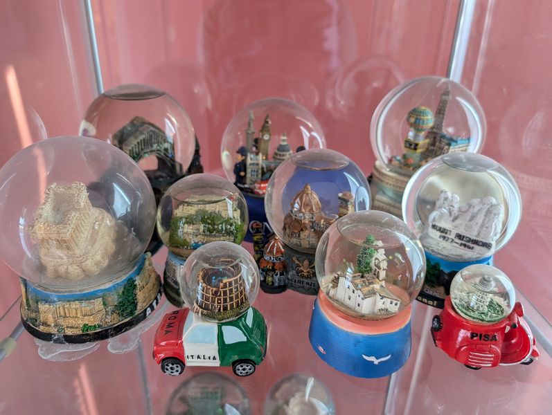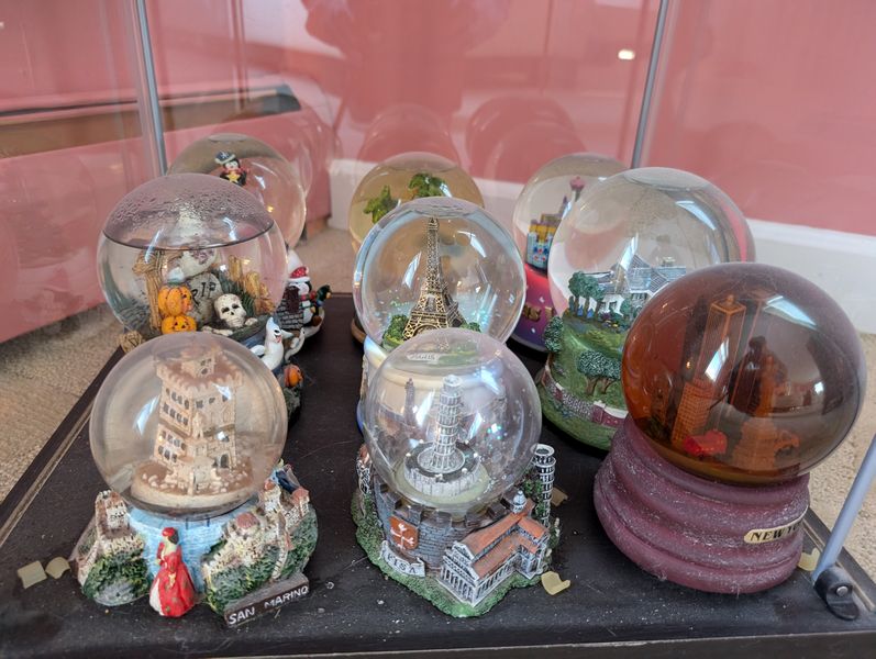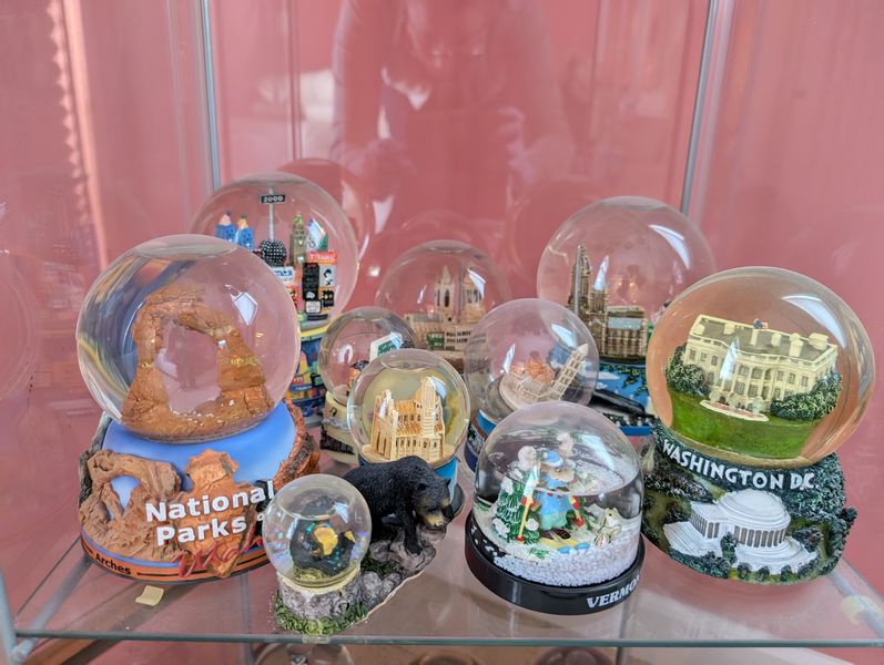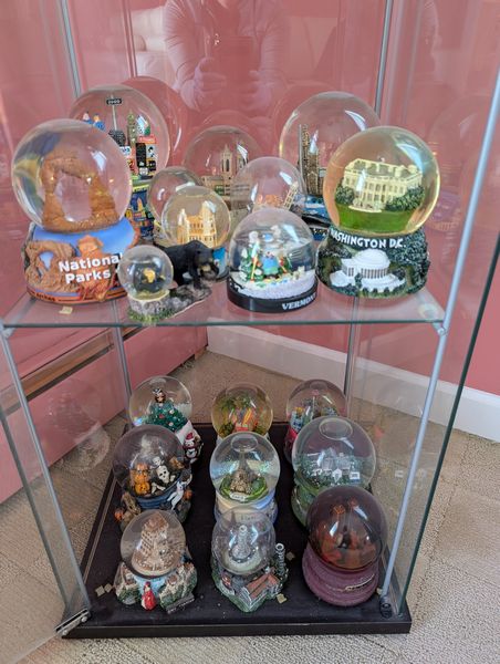 Snow Globes and Display Curio. Approx 40 snow globes from various travels; tall display case with glass on all sides, 17"Wx11"Dx64"H. Globes req dusting.