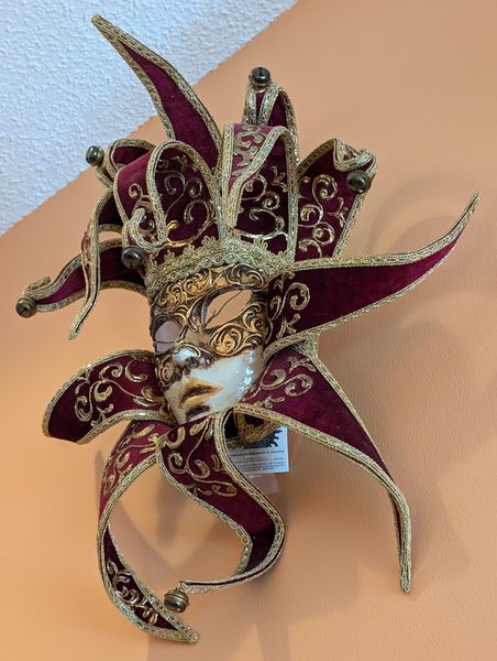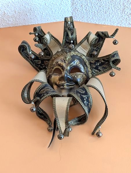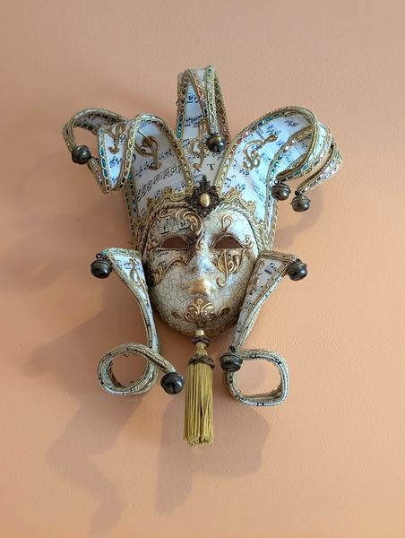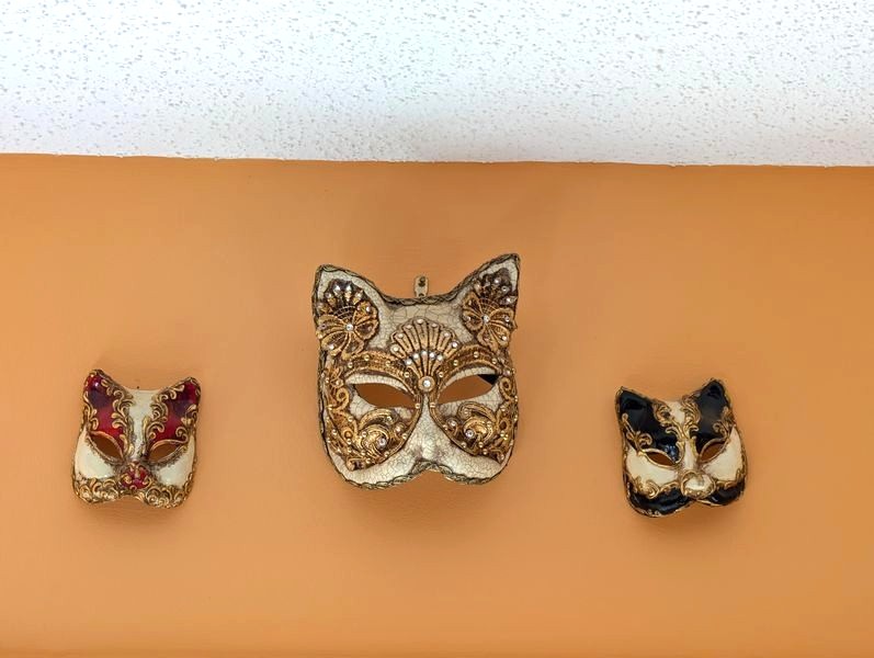 Masquerade Wall Décor. Three Mardi Gras masks, ea. approx. 18"; three cat masks, ea. approx. 6". See photos for details. Unable to access provenance. Located high on wall which will req ladder.