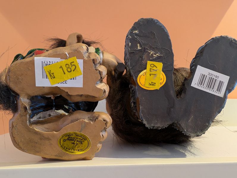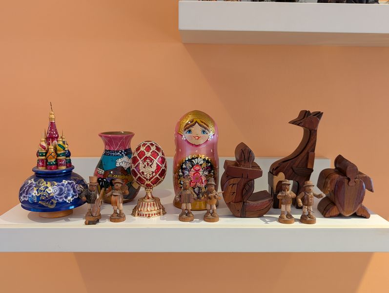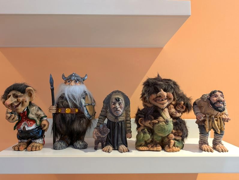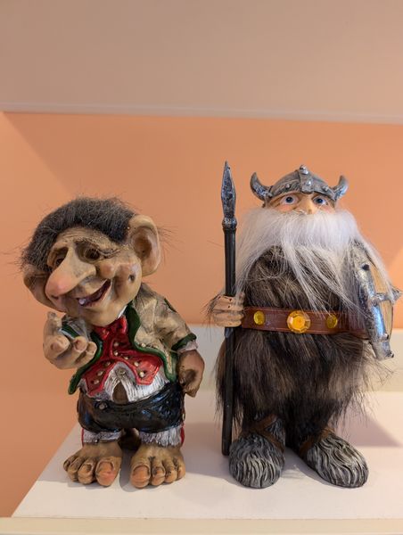 Collectibles International Décor. Five Nyform hand-made Norwegian troll dolls, ea. approx. (see photos for pricing); assort décor and dolls from various travels, incl three wood puzzles. See photos for more details. Shelves not incl.