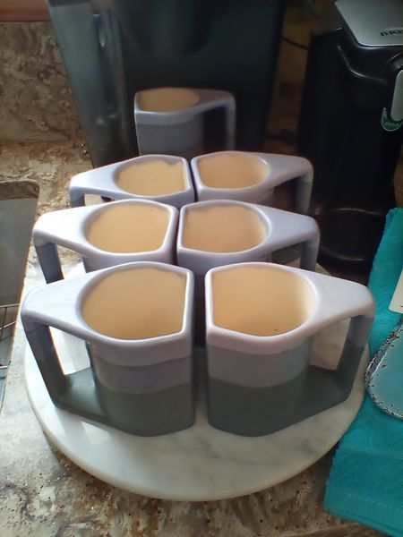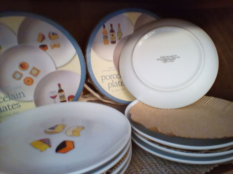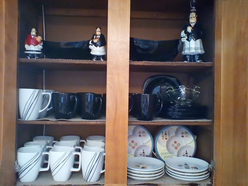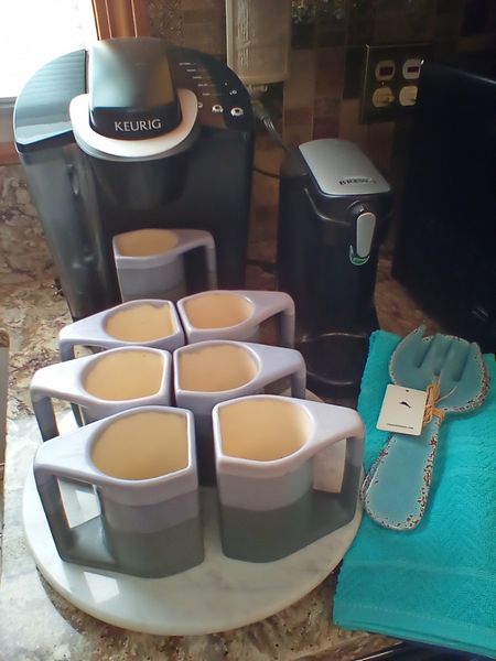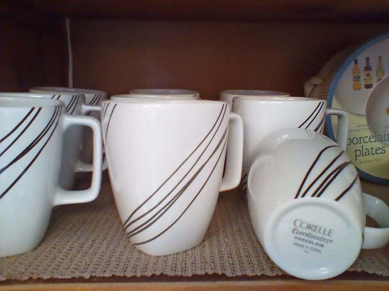 Countertop Appliances, Dish Sets. Corelle: set/12 B&W mugs; 26 pcs black mugs & bowls; two set/4 boxed porcelain plates; Brew 1-cup; stainless & blk microwave; Keurig coffee maker; 7-pc sign sq mug set; other related items as seen in photos.