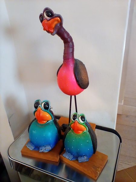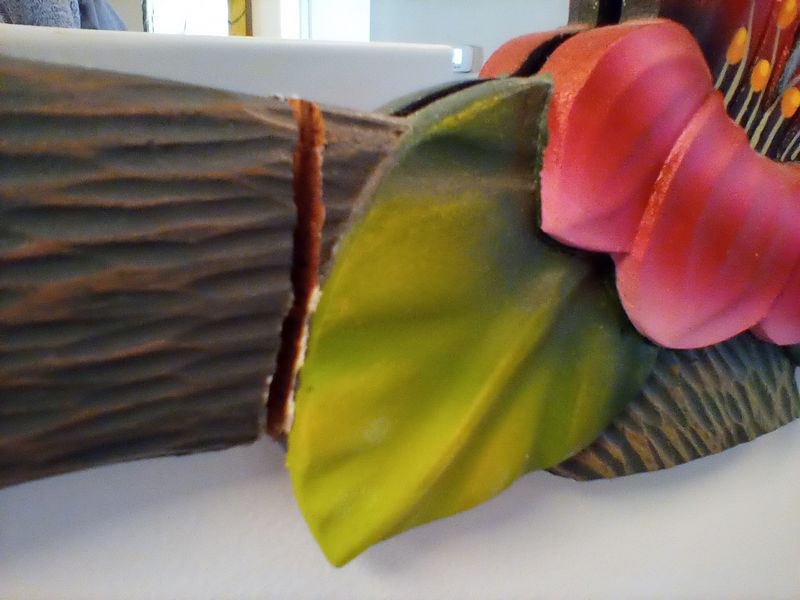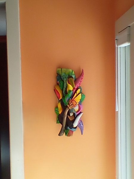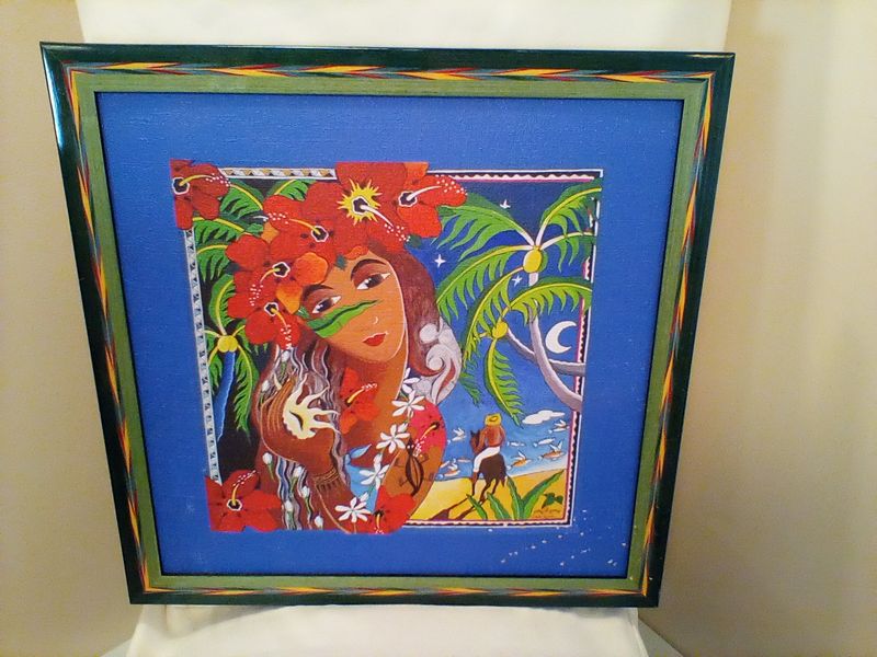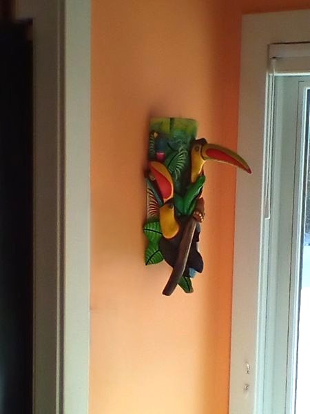 Tropical Décor. Incl: wall mirror, 17"Wx2'H (see photo crack in frame); signed Toucan wood wall hanging (detached beak), 18" (see photos); lg 3-parrot canvas print, 39"sq; colorful blk-lacquered framed print of woman; three pcs whimsical décor.