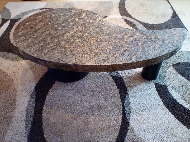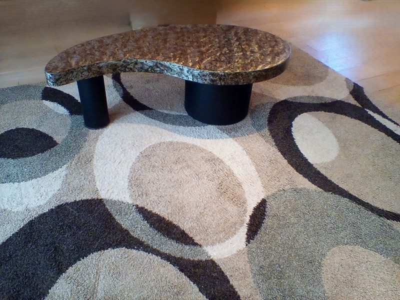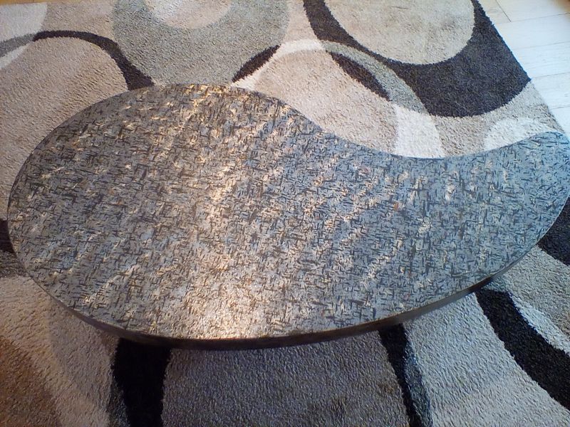 Contemporary Coffee Table and Rug. Approx 8'x9'. Modern coffee table with metallic top, approx. 58"Lx30"Wx18"H; geometric Turkish area rug, approx. 8'x9' (req cleaning). Items seen in background not incl.
