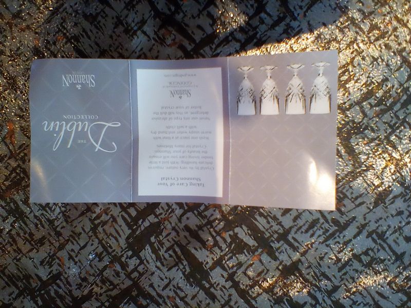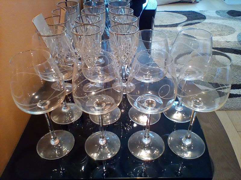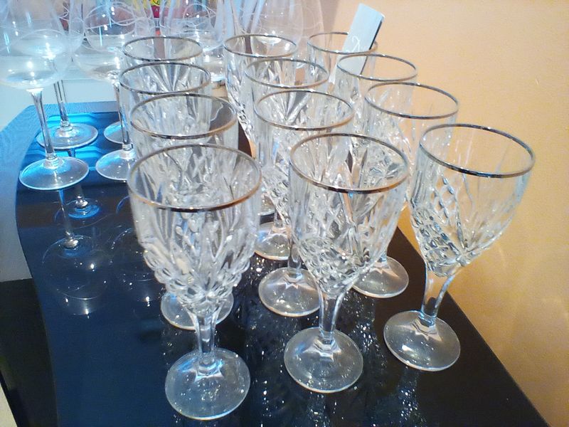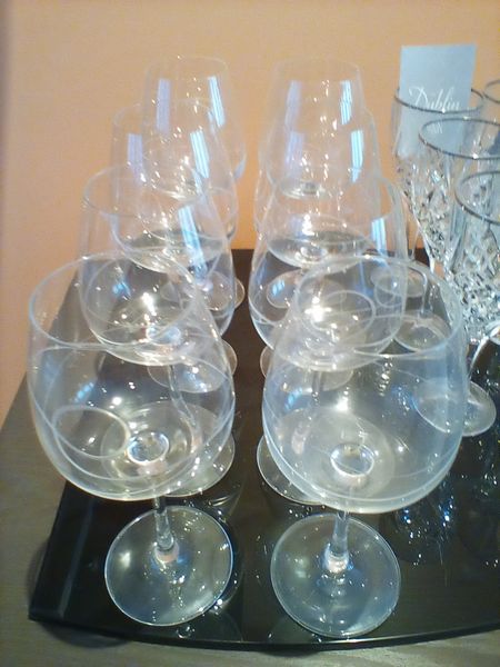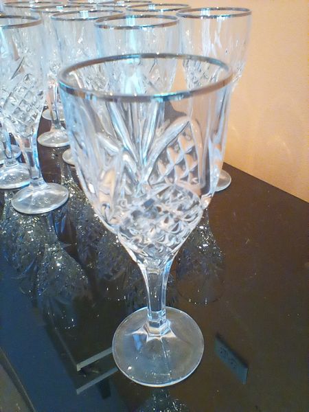 Crystal Stemware. Two sets: set/12 Shannon "The Dublin Collection" crystal wine glasses with gold trim; set/8 tall etched red wine glasses with modern swirl design.