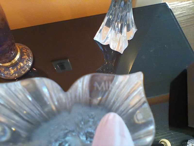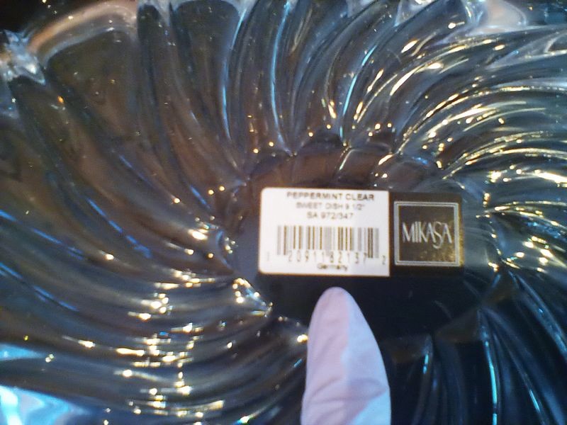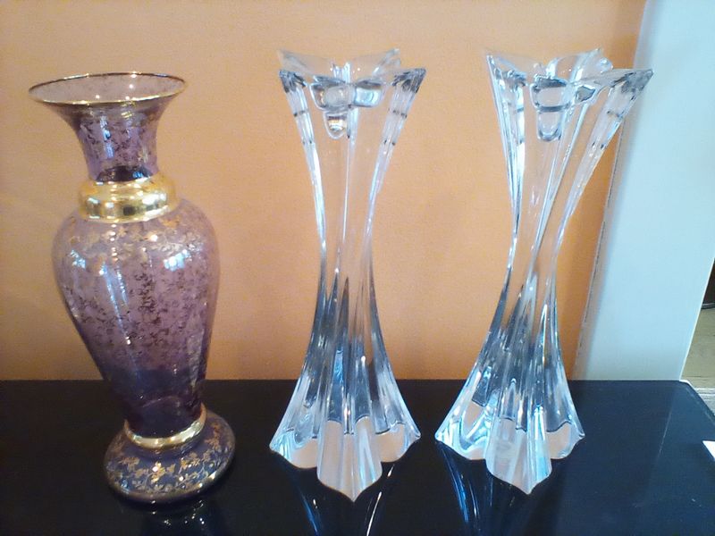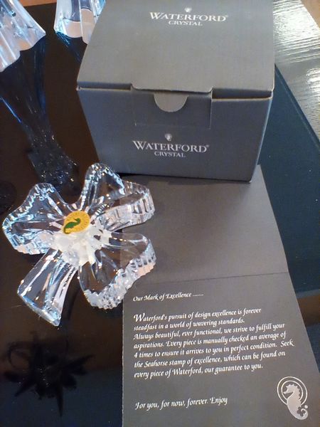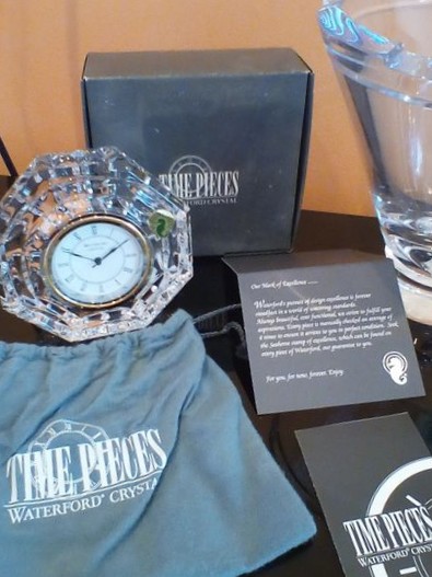 Fine Crystal and Glass Entertaining, featuring Waterford and Oneida. Two Waterford pieces including octagonal "The Pieces" crystal clock (new in box); crystal shamrock decor (new in box); modern crystal Orrefors bowl or vase, 9"diam x8"H; pair of Mikasa candlesticks, ea. 10"H; Mikasa tray; other related items as seen in photos.