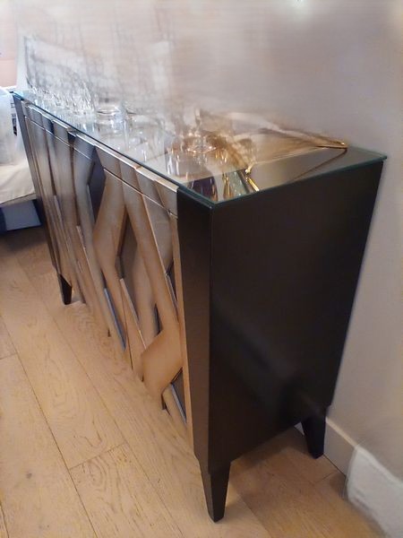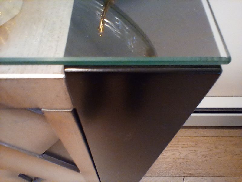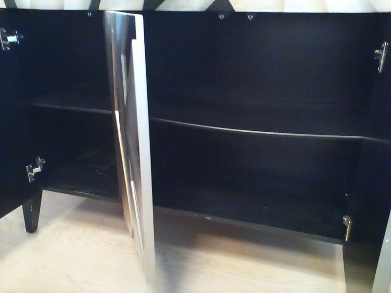 Contemporary Black Lacquered Sideboard Buffet. Contemporary buffet cabinet with fixed shelves and custom 1/4 thick glass top, 54"Wx16"Dx37"H. See photos for details. Items seen on top of cabinet not incl.
