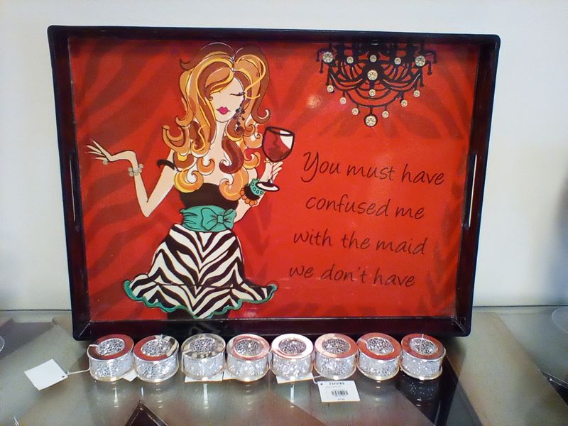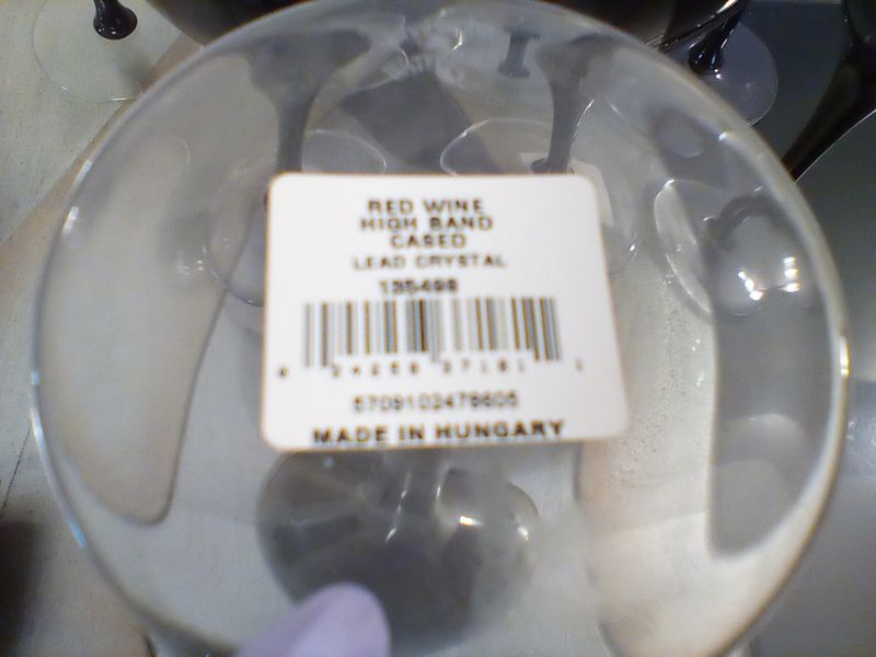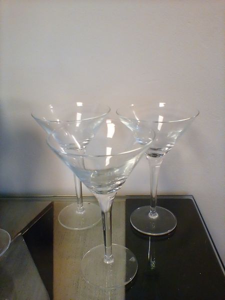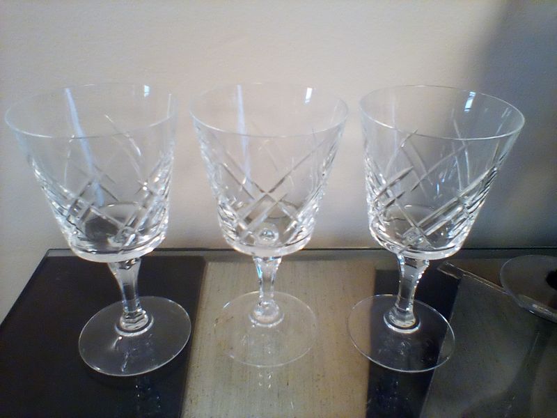Waterford Hungarian Signed Stemware. Set/8 black Waterford lead crystal wine glasses by John Rocha; sets/3 crystal etches stemware; set/3 martini glasses; set/8 unused decorative napkin rings; whimsical serv tray, 19"x14".