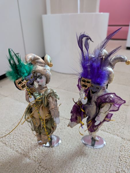 Masquerade Wall Décor. Approx 20 pcs, incl largest doll, 22"H. Also incl: music box; masks; dolls; ornaments. See photos for details.