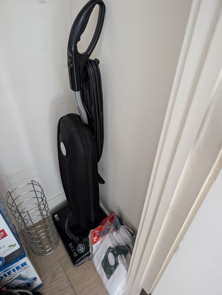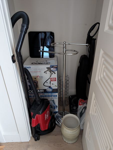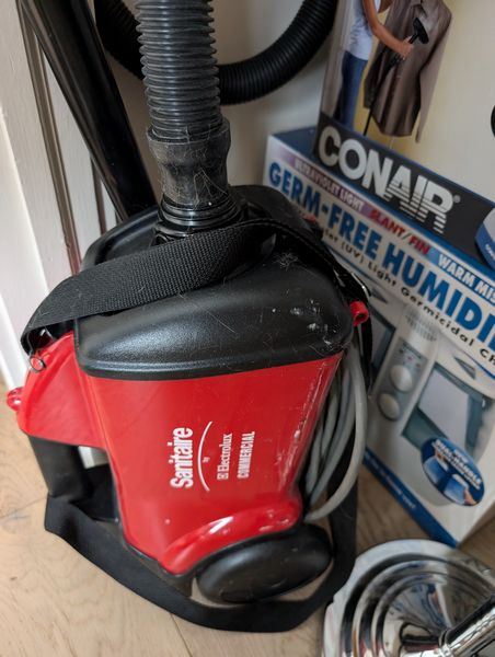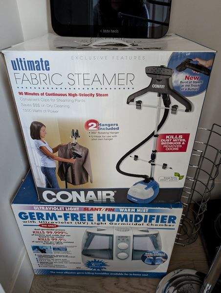 Household Functional. Vacuums, incl: Sanitaire, Riggar R17, Conair fabric steamer (in box); humidifier (in box); Sunbeam iron; Zadro make-up mirror; pr wood trays; other related items as seen in photos.