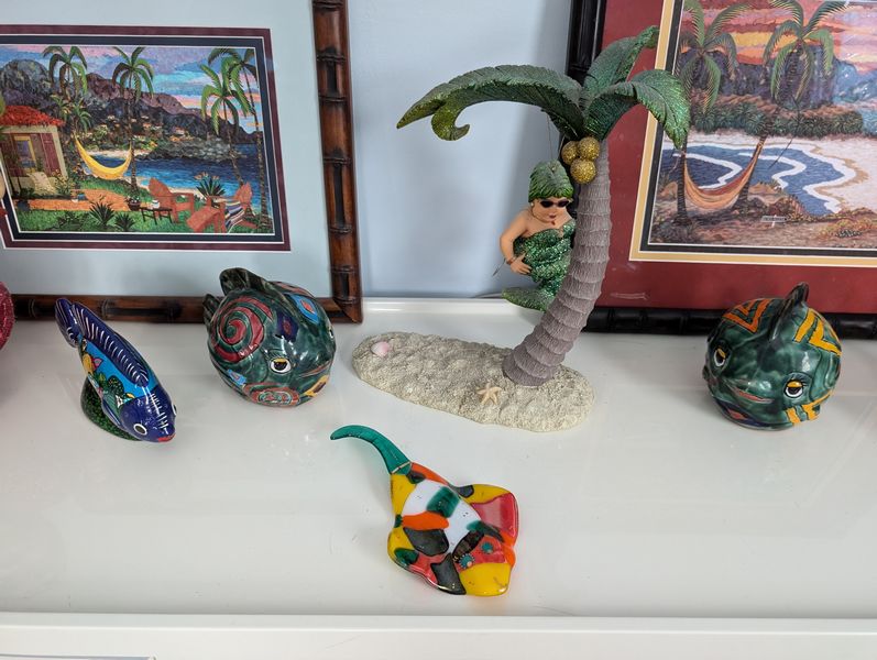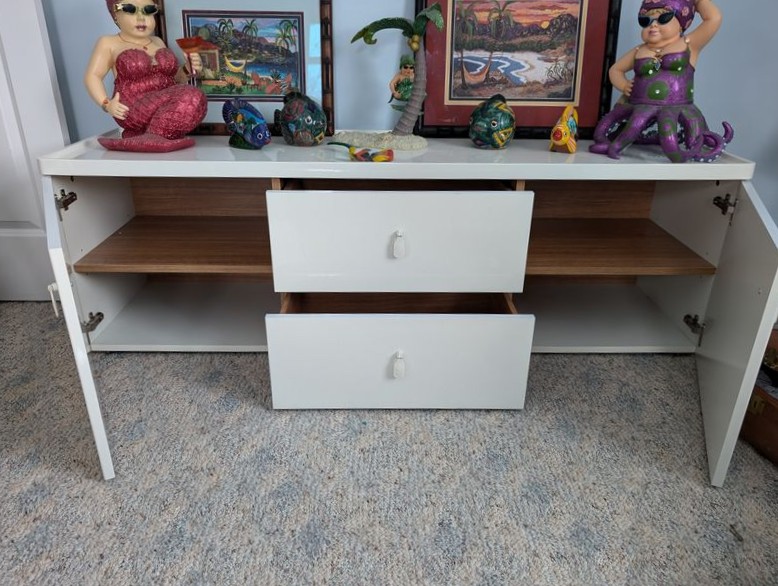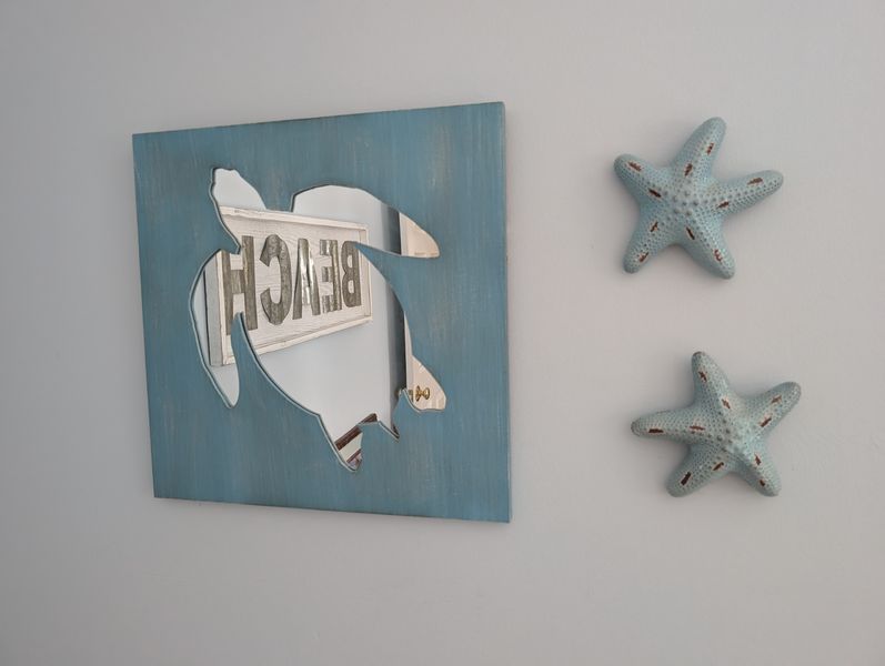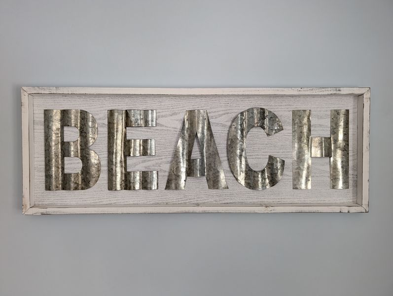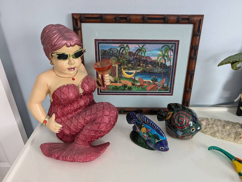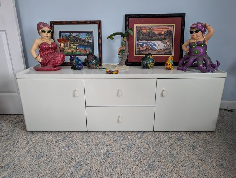 Beach Décor and Long Cabinet. Multi-functional white cab, 63"Wx17"Dx20"H (matches pcs in lots #41, 49); wall décor, incl destressed wood "Beach" sign, 44"Wx16"Hx2"thick; lg whimsical mermaid figures; other beach décor & wall art as seen in photos. Loc on 2nd floor. Bring help to navigate lg cabinet.