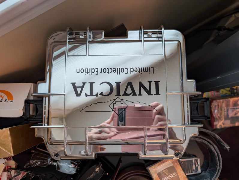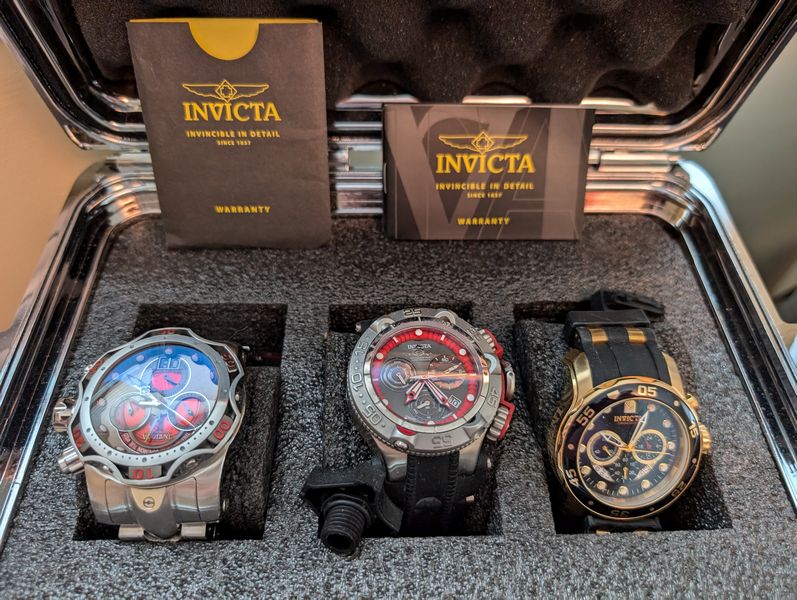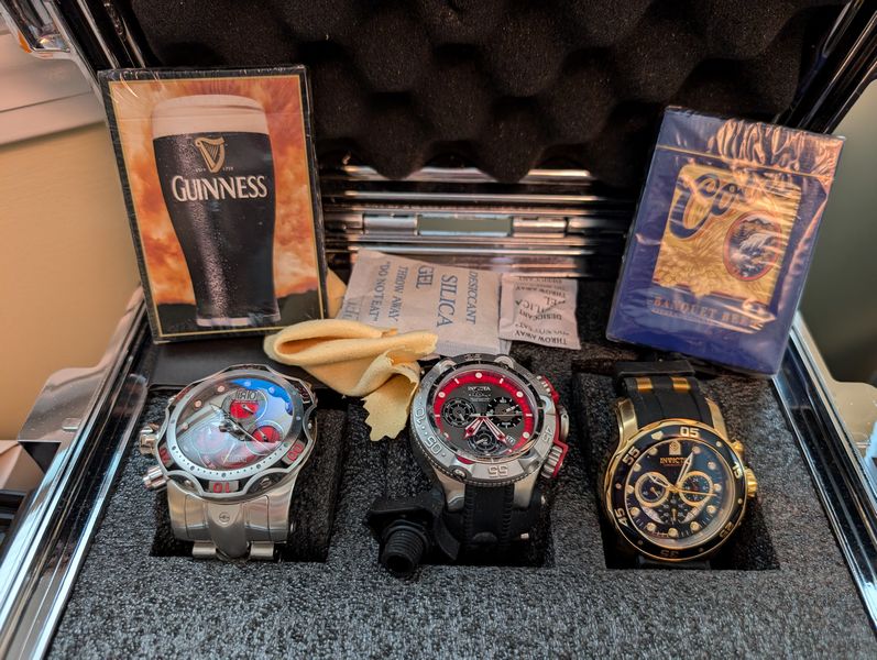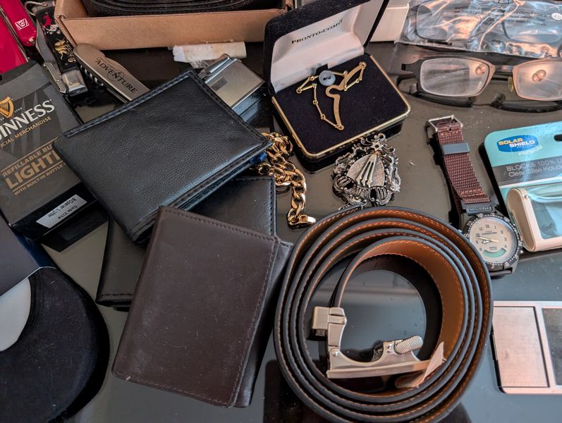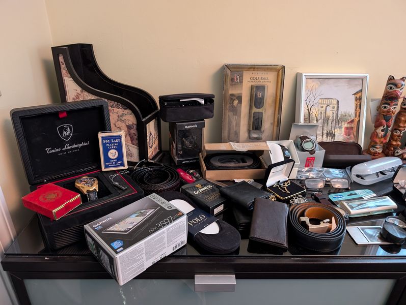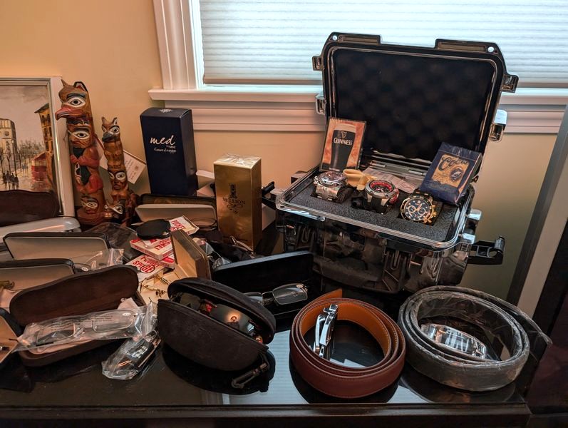 Men's Boutique, featuring Quality Watches. Conino Lamborghini watch in case; three Invicta watches in metal case; belts; wallets; glasses; décor. See photos for details and quantities. Dresser seen in photos not incl. Loc on 2nd floor.