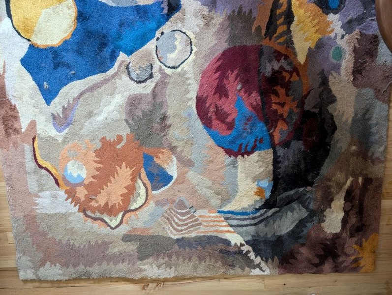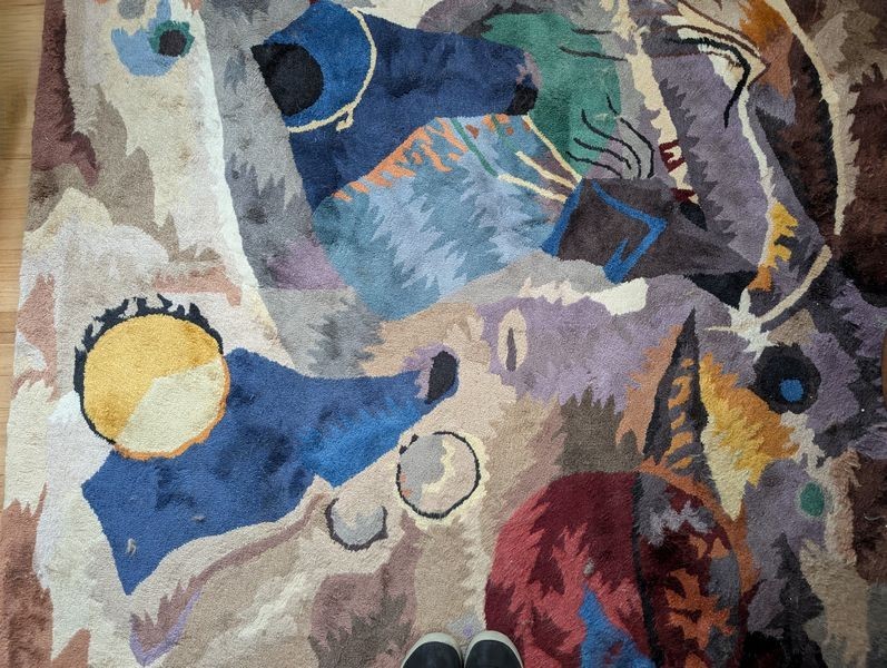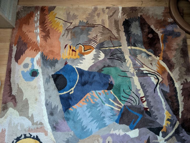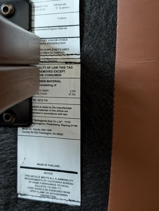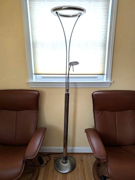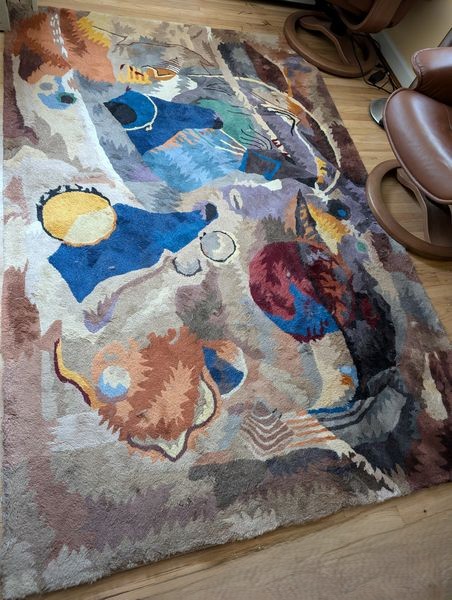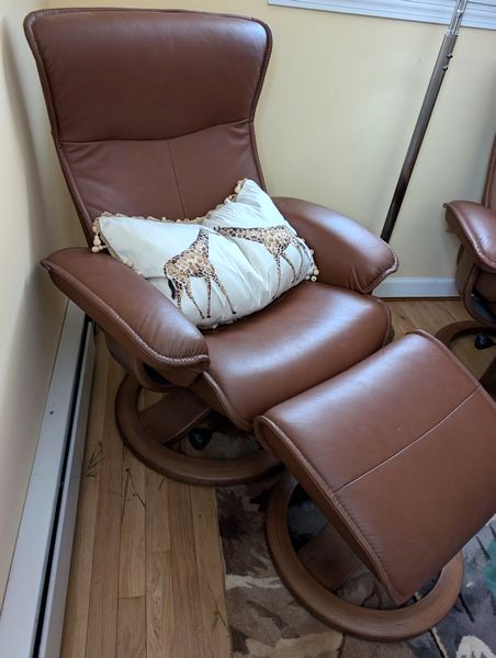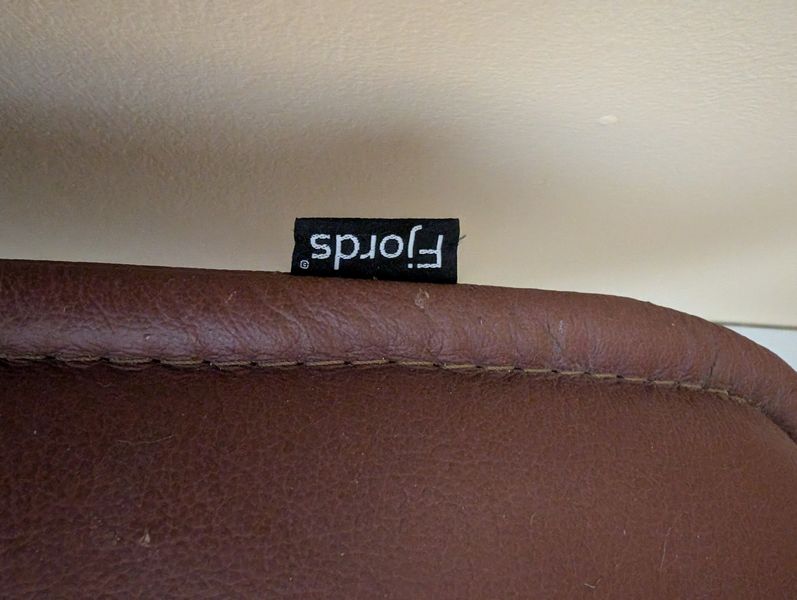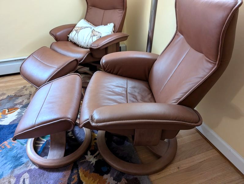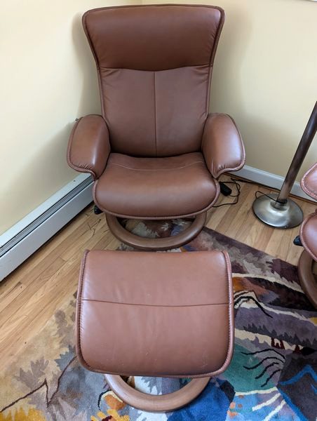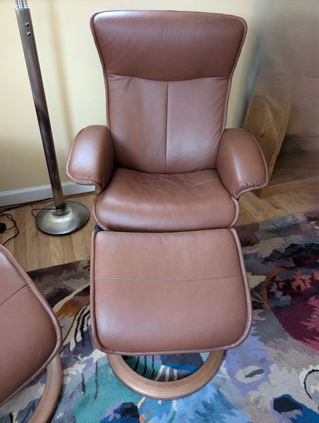 Fjords Recliners; Floor Lamp; Area Rug. Pair of light brown leather Fjords recliners, ea. 32"Wx26"Dx39"H with foot rests, ea. 21"Wx15"H; nickel floor lamp, 6'H; New Wave area rug, approx. 5'x8' (req cleaning); giraffe pillow. Loc on 2nd floor.