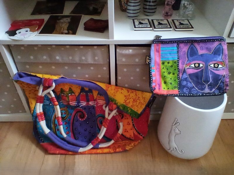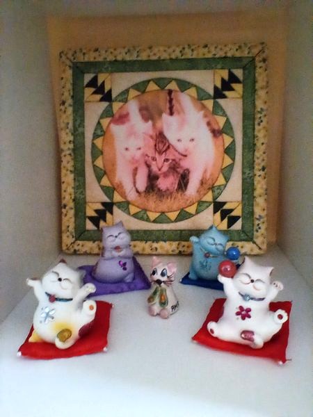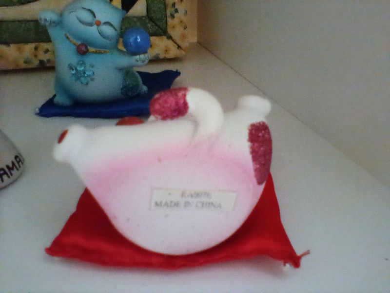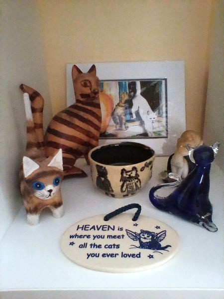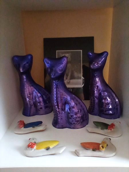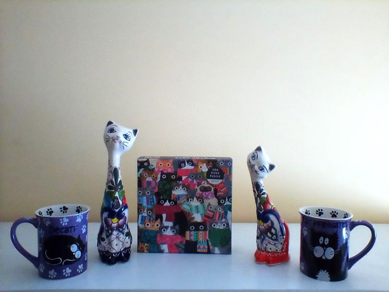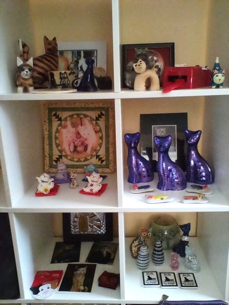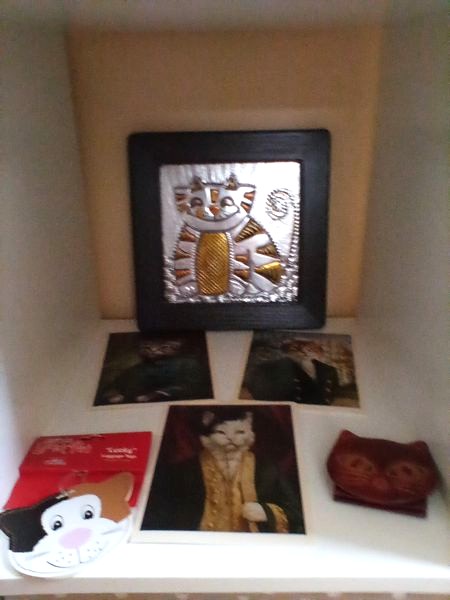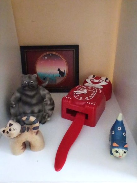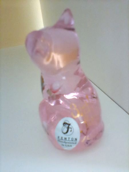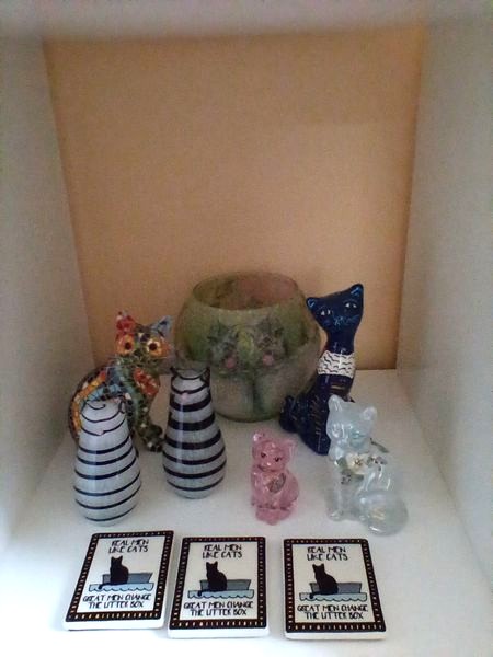 Cat-Themed Décor. Vintage red Kit Cat clock, model #B2, signed porcelain & glass pcs, incl Fenton & others (see photos); wall art; tote bag; trash pail; mugs; other items. Over 50 pcs. Loc on 2nd floor.