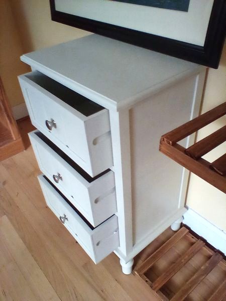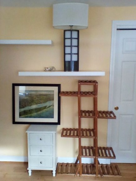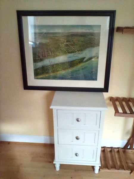 Furniture and Art. Wood bookcase, 30"Wx1'Dx6'H with two adjustable & two static shelves; plant stand approx. 28"Wx10"Dx52'H; white three-dr cab, 16"Wx1'Dx26"H; modern table lamp, 31"H with fabric boat-shaped shade; framed & matted, wall art of No. Palm Beach behind glass, 27.5"Wx2'H. Loc on 2nd floor.