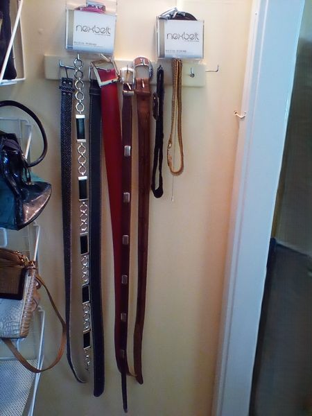 Designer Handbags and Belts, featuring Kate Spade, Brahmin, Peruzzi. Fifteen handbags incl: Kate Spade; Brahmin; Peruzzi; two vintage beaded clutches; brown striped bag from Spain; red tote by LaCoste; black zebra print by Stacey Whitmore; two Next belts (pink, black); eight other assort belts (see photos for details); Loc on 2nd floor in walk-in closet (right wall).