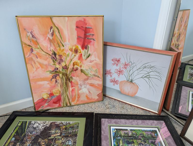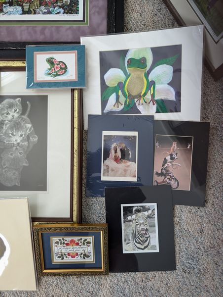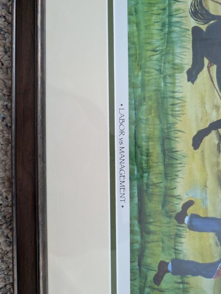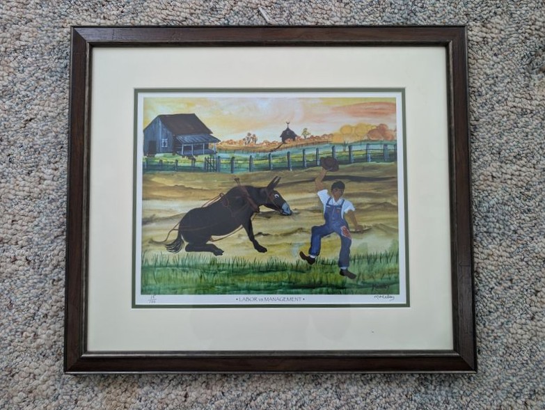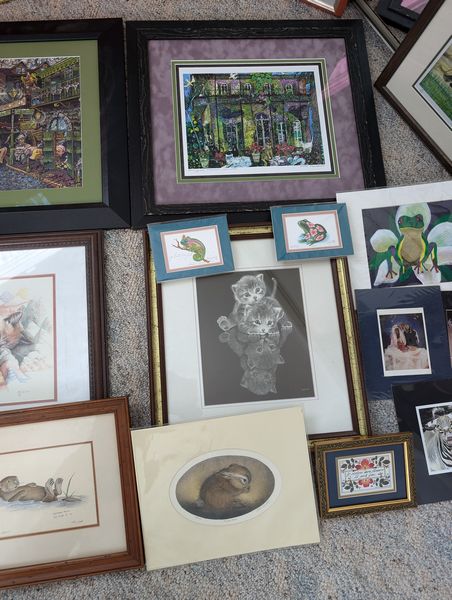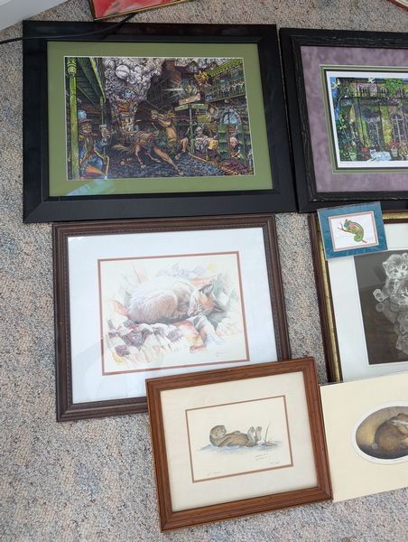 Wall Art, Some Signed. Sixteen pieces, including largest 25"Wx30.5"H; sign Moseley & numbered 15/100 donkey "Labor vs Management framed wall art, double-matted & behind glass, 20"Wx17.5"H; Sea Otter framed & matted, behind glass, signed & #152/1000; Baby Hare sign (unframed), #98/100; others as seen in photos. Located on the second floor.