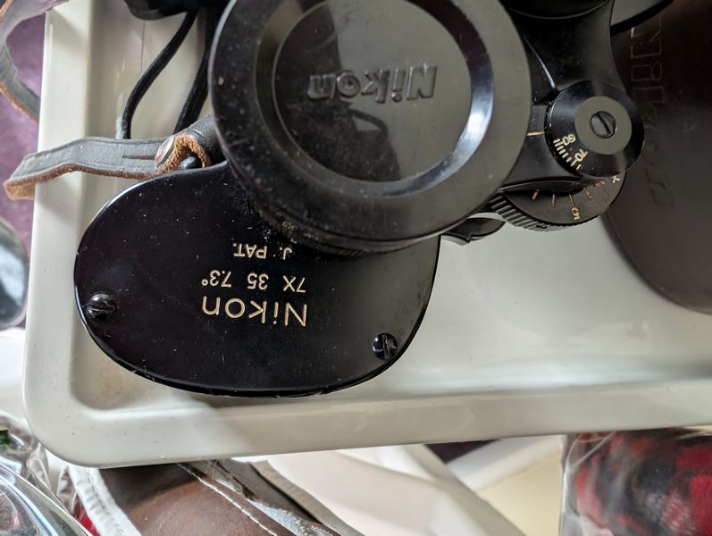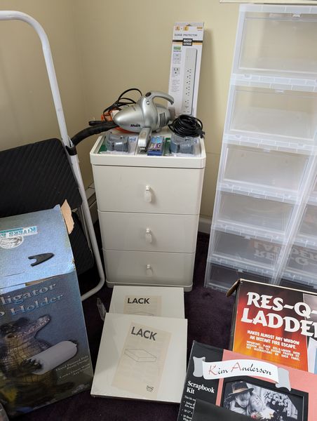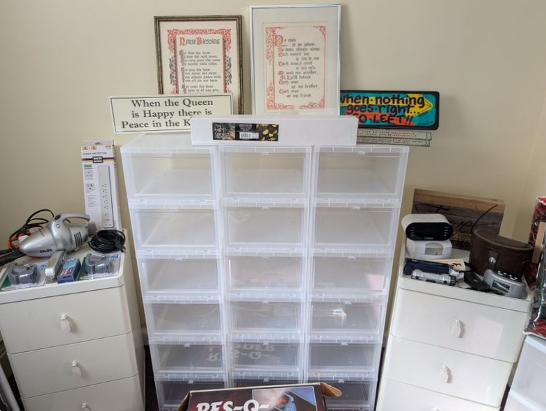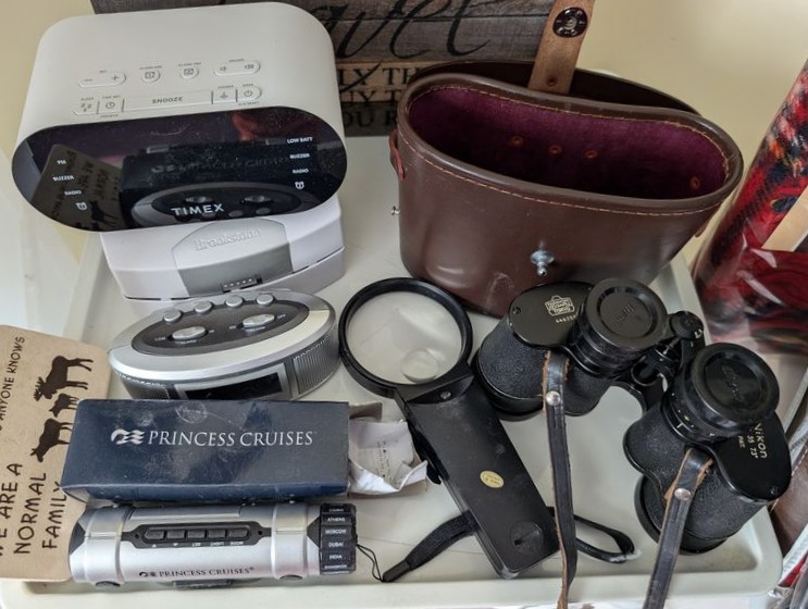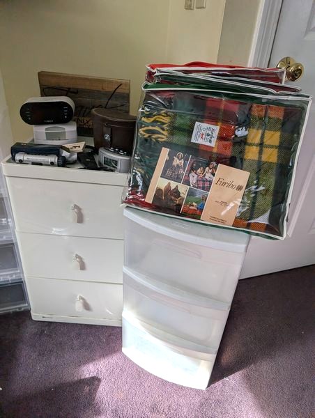 Household Functional, featuring Shoe Storage. Eighteen stacking shoe storage containers, overall 34"Wx14"Dx42"H; fringed area rug, approx 3'W (length not known); folding step ladder; pair of three-drawer white nightstands (matches furniture in lots 40, 41, 49); three-drawer white plastic storage; (four) fringed blankets; whimsical toilet paper holder (boxed); assorted wall decor; electronics (radios, etc); Nikon binoculars in case; other related items as seen in photos. Located on the second floor.