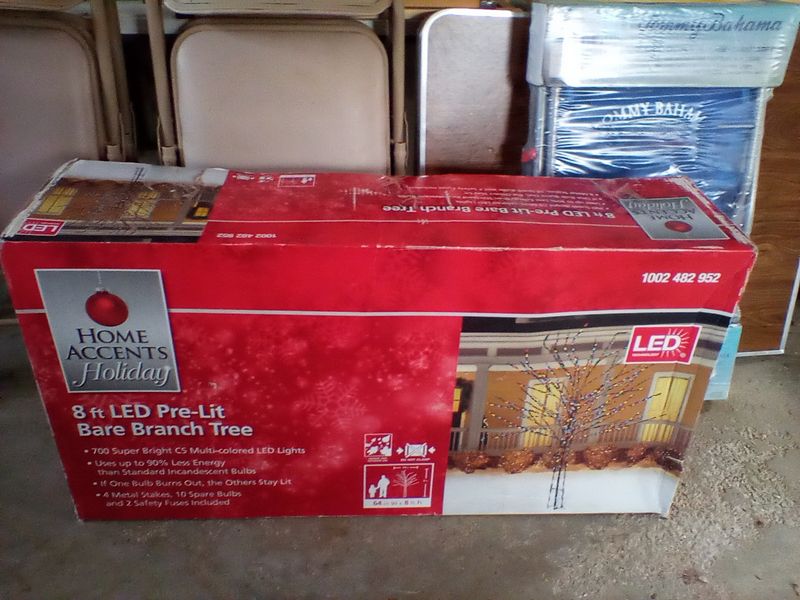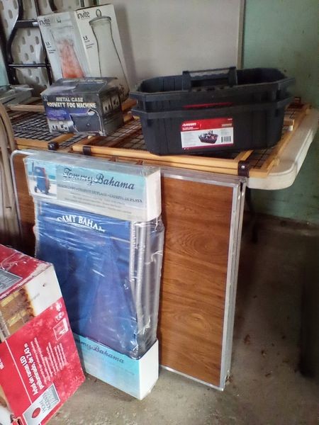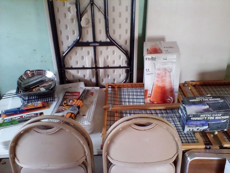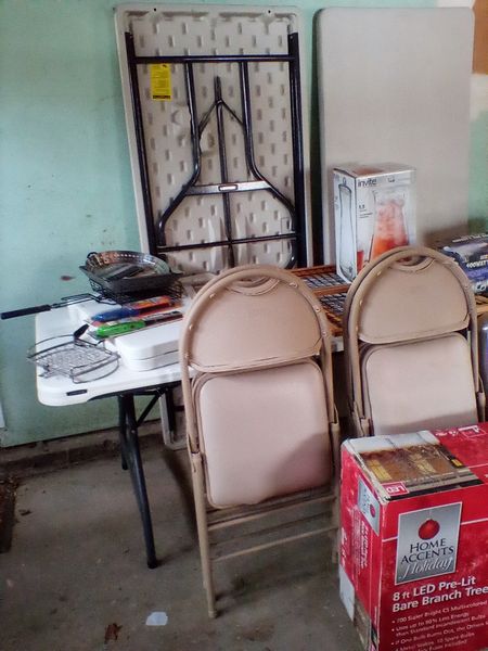 Household Functional. Five folding tables; set of four folding chairs; grilling items; 8' LED outdoor tree (boxed); Tommy Bahama (unsued) beach cart; other related items as seen in photos. Located in the garage.