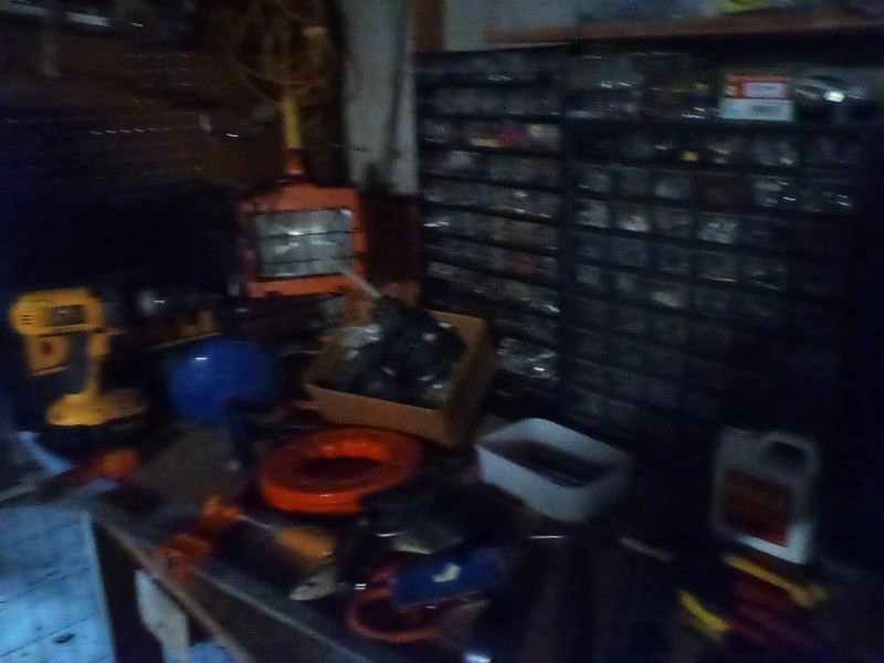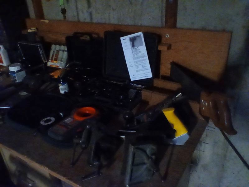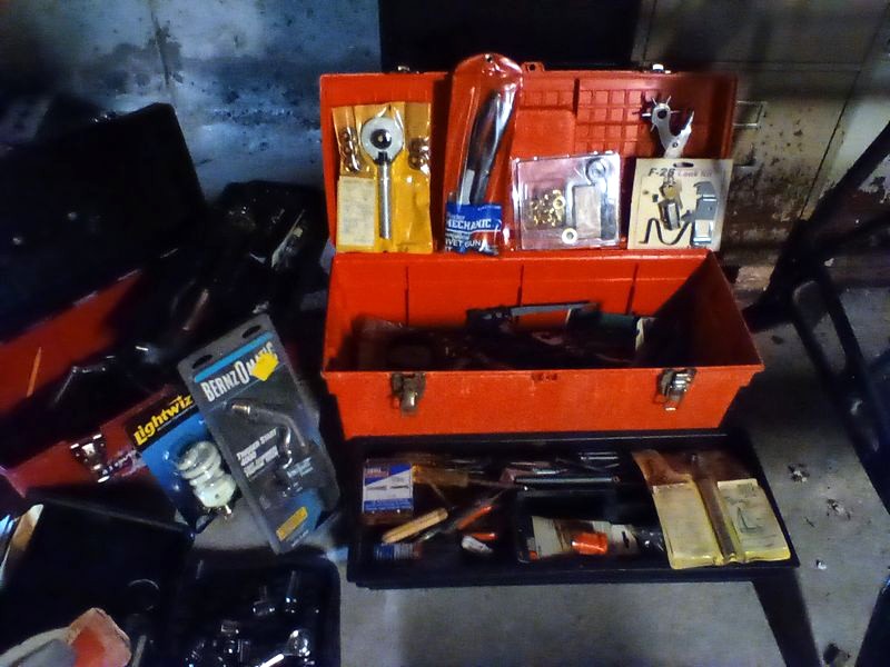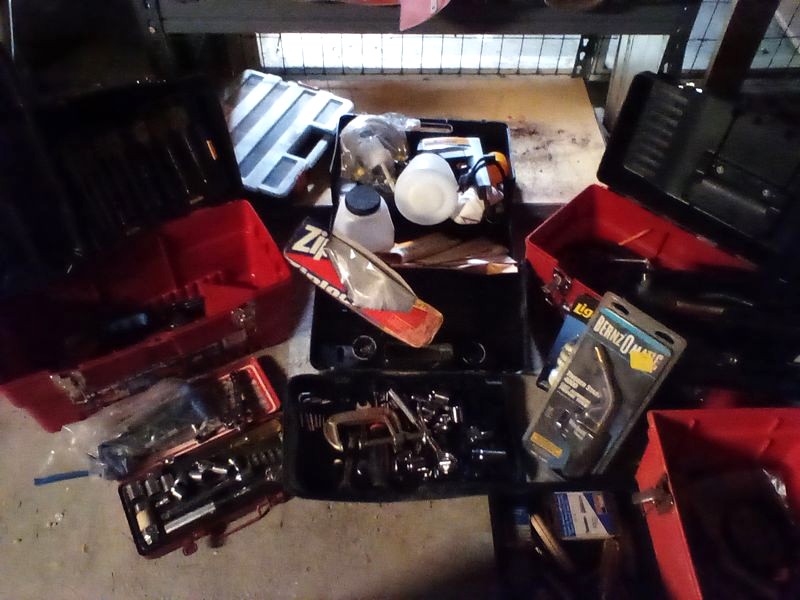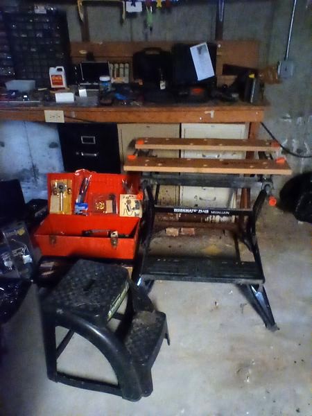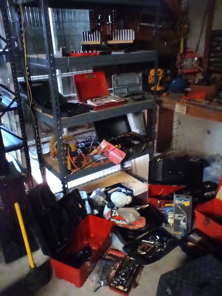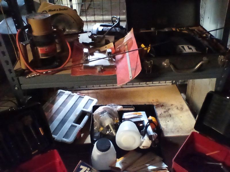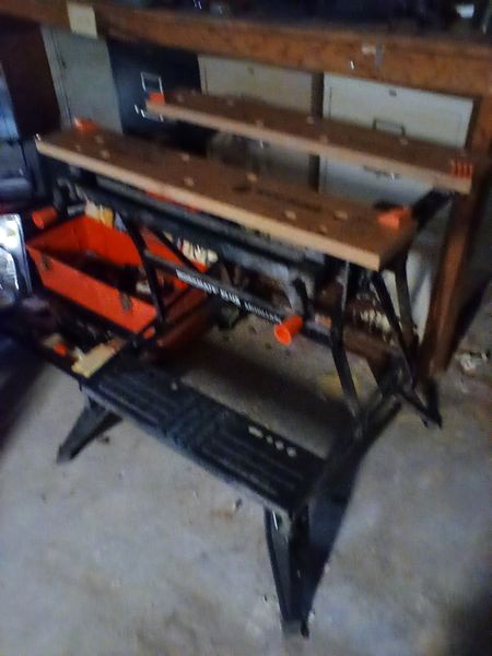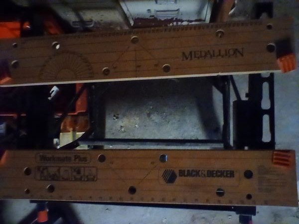 Hand and Power Tools, Work Bench. Black & Decker Workmate Plus workbench; assorted hand & power tools; miter saw; tools boxes; hardware. Metal file seen in photos & items in background not including. Shelving not including. Located in the basement (hatchway covered by snow).