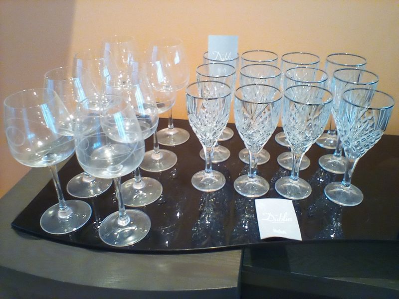 Crystal Stemware. Two sets: set/12 Shannon "The Dublin Collection" crystal wine glasses with gold trim; set/8 tall etched red wine glasses with modern swirl design.