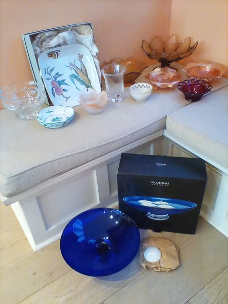 Colored Glass and Crystal Fine Entertaining Pieces, featuring Waterford, Offefors, Delft, Royal Worcester, Lenox. Illusions 13"diam floating candle bowl (unused); Royal Worcester fruit & veggie dish, 11"x1'; Delft bowl; Waterford crystal fruit bowl; Offefors vase; Lenox small bowl; colored glass incl pedestal fruit bowl, 1'diam. See photos for maker's marks and other related items incl.