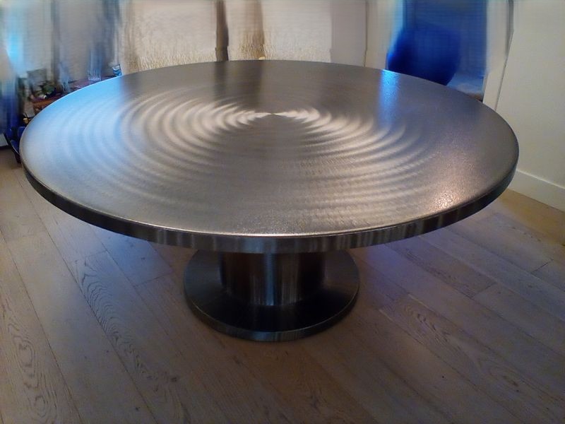 Metallic Round Pedestal Dining Table. Round dining table with swirl design on a pedestal base, 66"diam x30"H. Items seen in background not incl.