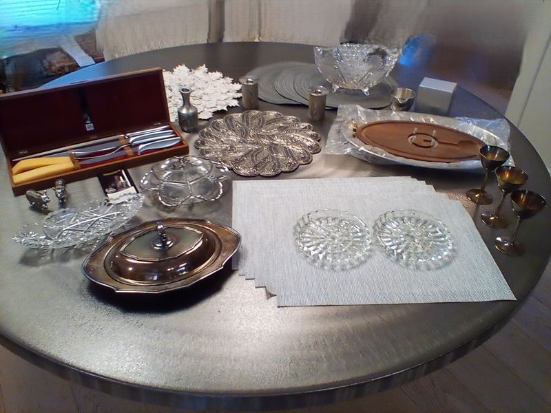 Metal and Glass Entertaining Pieces. Incl: Stieff pewter cup; Gerber Legendary 4-pc carving set in box; meat carving platter, 18.5"L; assort quality placemats; candlestick holders; vase; vintage cut glass bowls (largest 11"diam); silver plate covered dish.