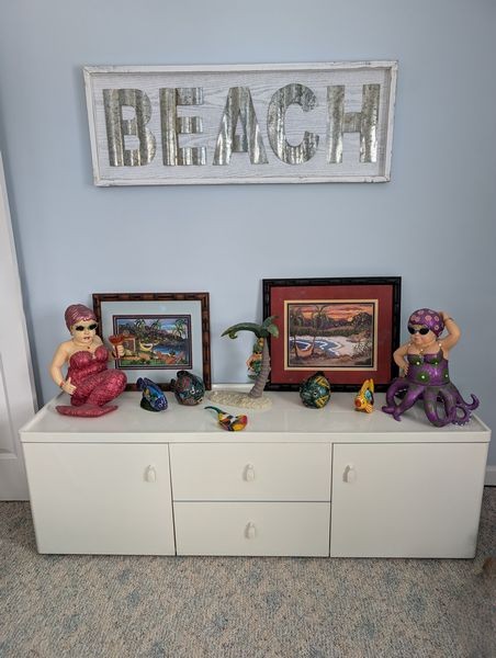 Beach Décor and Long Cabinet. Multi-functional white cab, 63"Wx17"Dx20"H (matches pcs in lots #41, 49); wall décor, incl destressed wood "Beach" sign, 44"Wx16"Hx2"thick; lg whimsical mermaid figures; other beach décor & wall art as seen in photos. Loc on 2nd floor. Bring help to navigate lg cabinet.