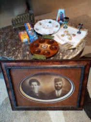 Judaica Art and Entertaining. Framed portrait, 28"Wx21"H; Seder plates (see maker's mark); candles; other related items. Table & area rug seen in photos not incl.