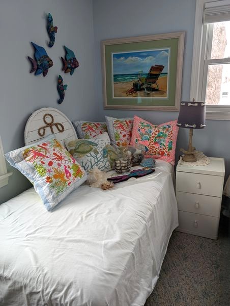 Beach Décor and Small Cabinet. Signed & framed beach motif print, triple-matted, behind glass, 35"Wx29"H; three-drawer white side cab (matches pcs in lots #40, 49), 15.5"sq x26"H; (5) colorful throw pillows, ea. approx. 15"sq; fish décor; shells. See photos for more details. Bed seen in photos not incl. Loc on 2nd floor.