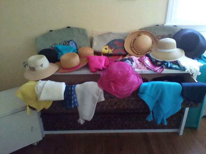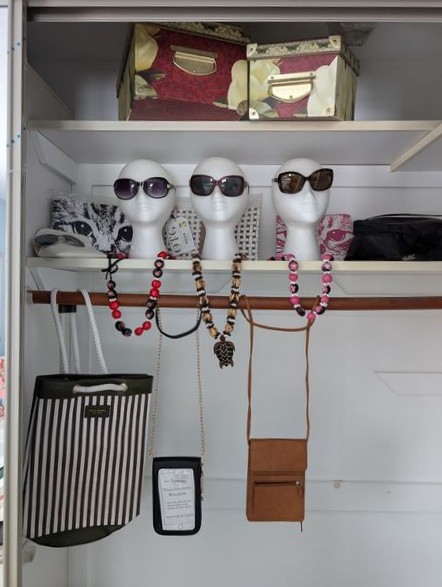 Women's Boutique Items, Small Cabinets, Lamp. White rolling cab (matches pcs in lots #40, 41), 15.5"sq 21,5"H; single-drawer side table, 25"Wx19"Dx2'H; hats; scarves; bags; table lamp with shade, 21". Loc on 2nd floor.