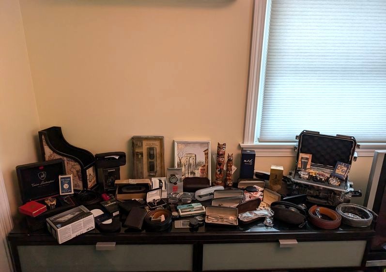 Men's Boutique, featuring Quality Watches. Conino Lamborghini watch in case; three Invicta watches in metal case; belts; wallets; glasses; décor. See photos for details and quantities. Dresser seen in photos not incl. Loc on 2nd floor.